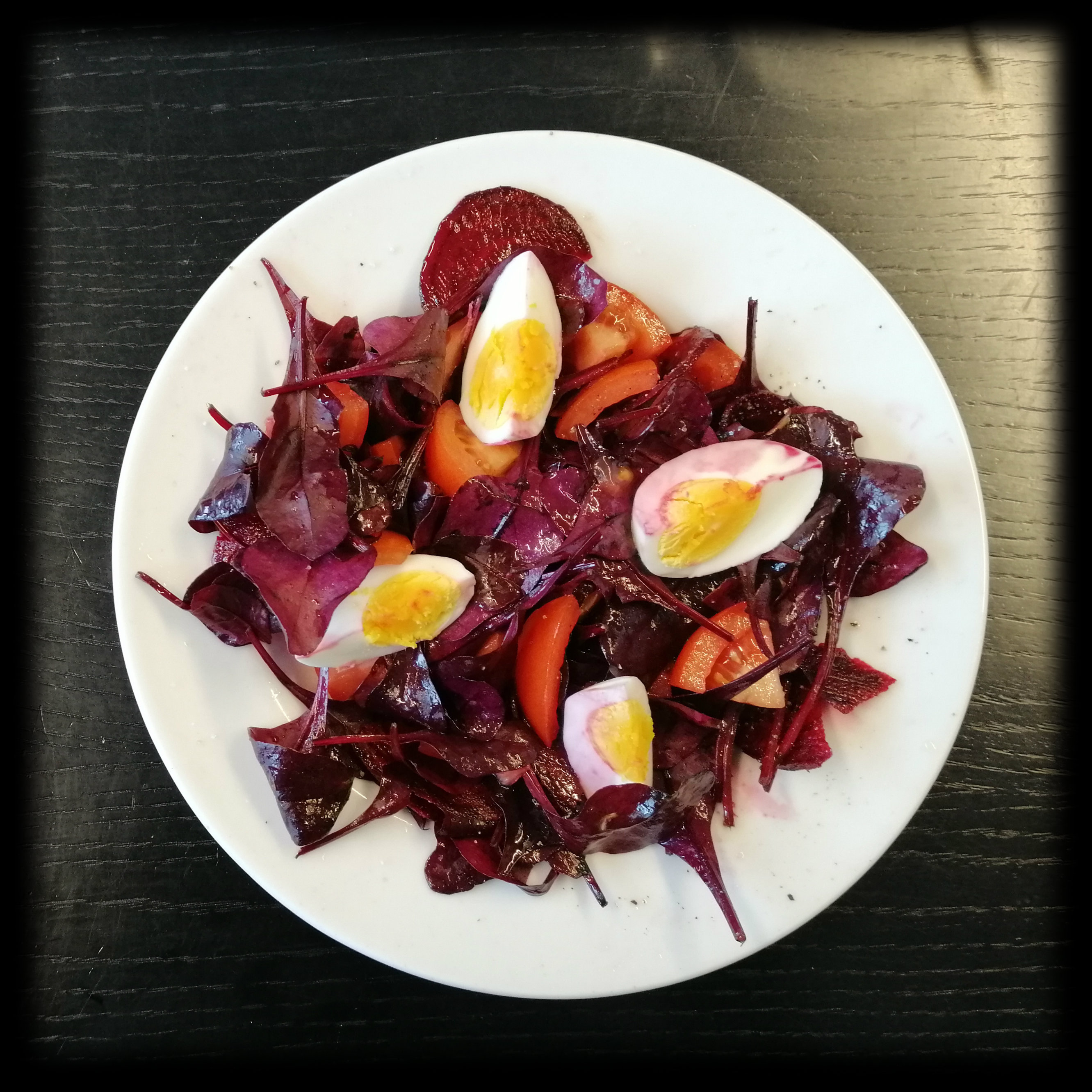 1/2 rote Bete (in hauchdünne Scheiben geschnitten, ggf. halbiert) einen Salat mischen und mit