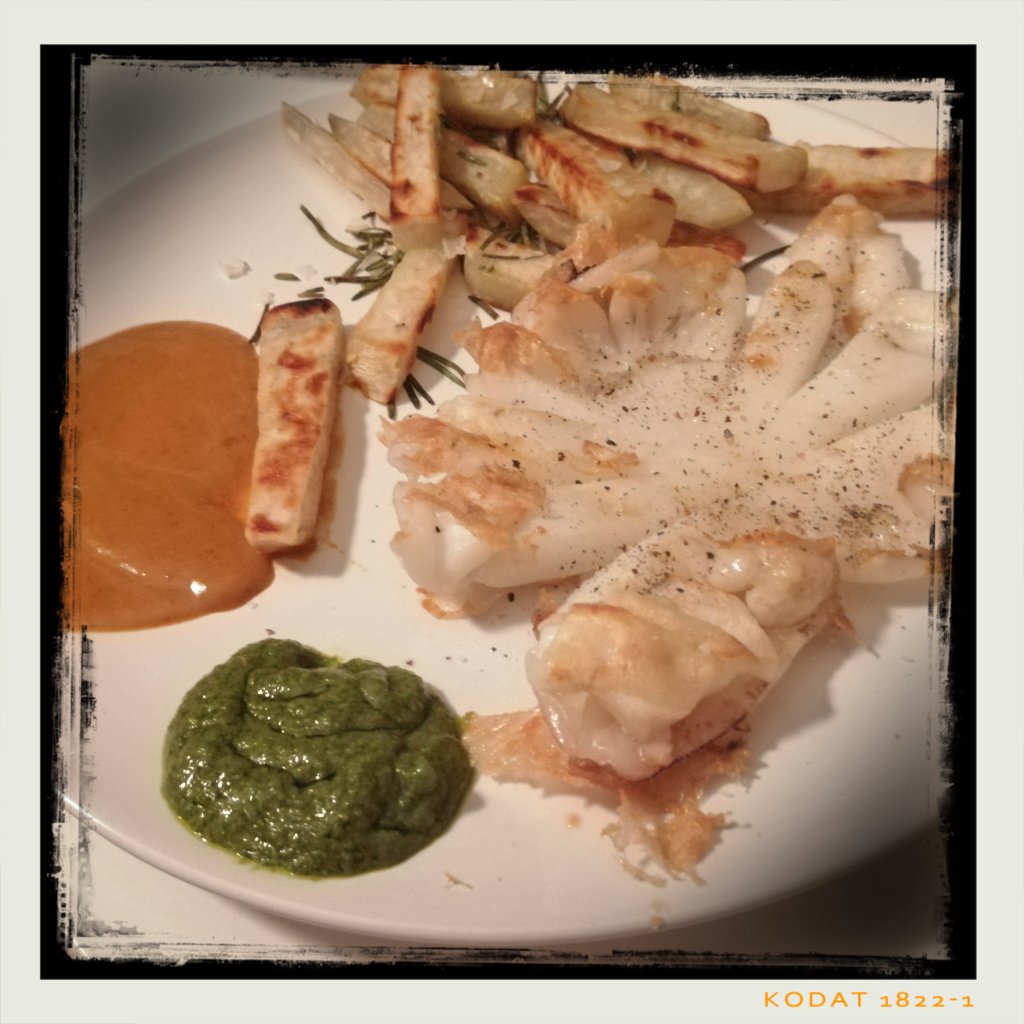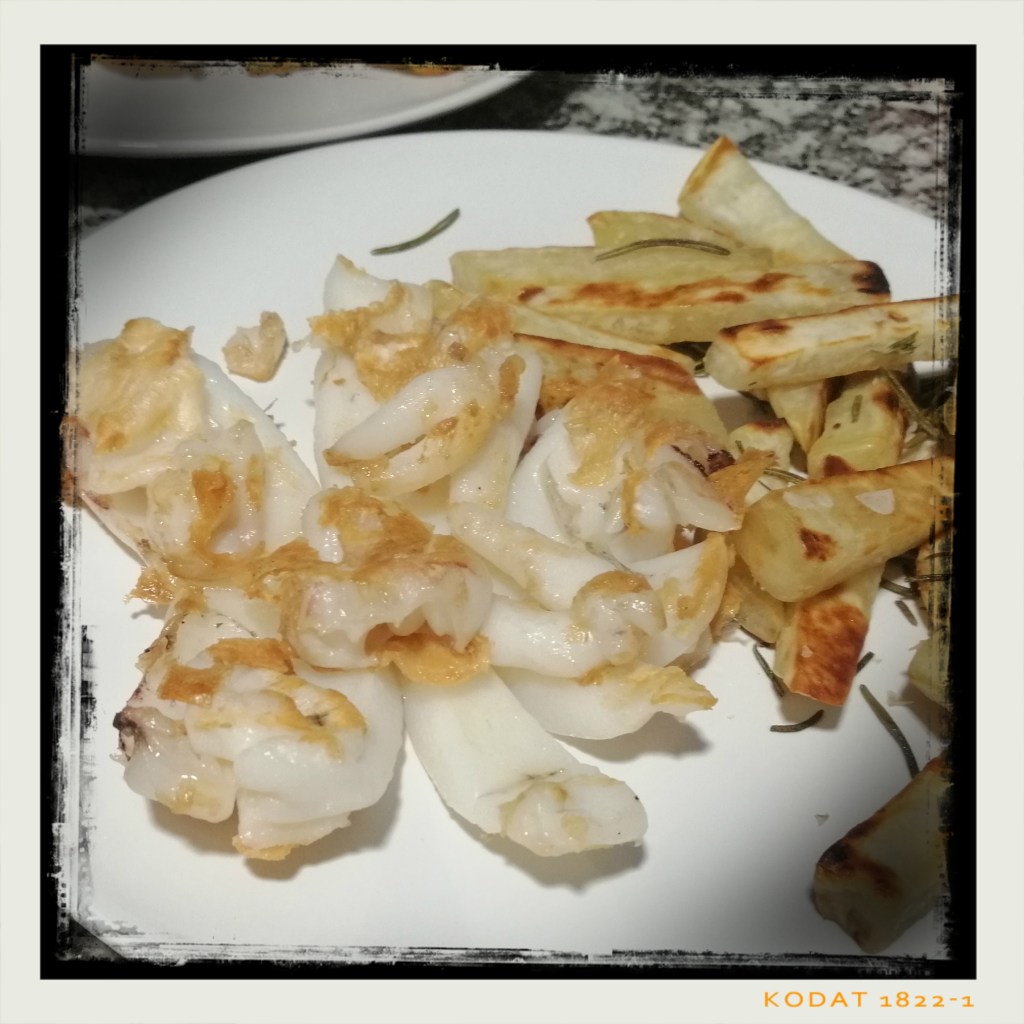 Chocos und Süßkartoffeln auf zwei vorgewärmten Tellern anrichten und Mojos dazu geben, dazu passt z. B. der Salat mit Mango (Rezept siehe 18. November 2019)