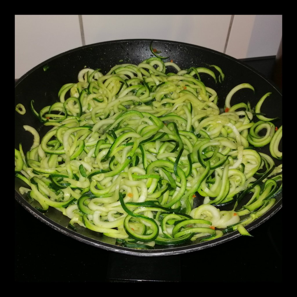 die Zucchini-Spaghetti unter Zugabe von