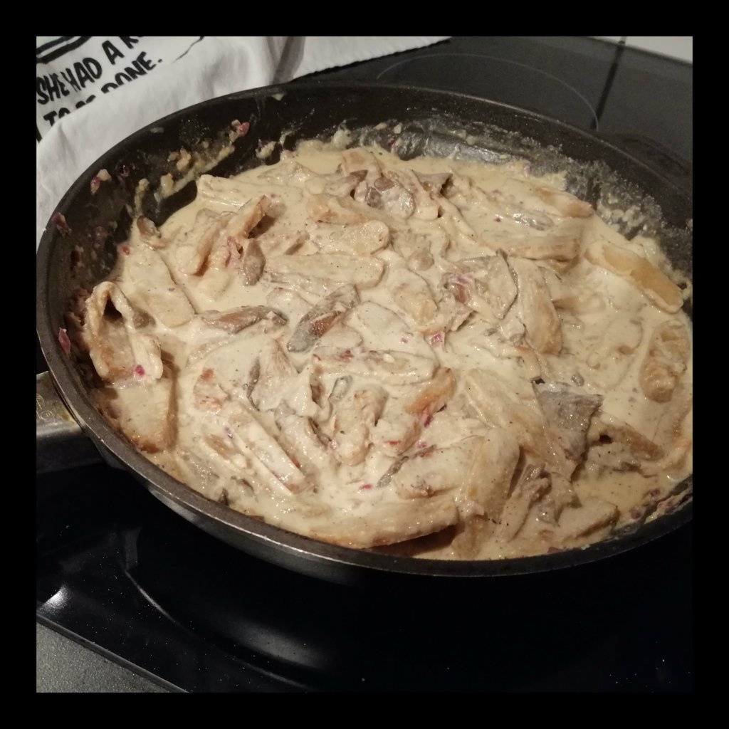 200 ml Hafercuisine zu den Austernpilzen geben und knapp zum Kochen bringen,