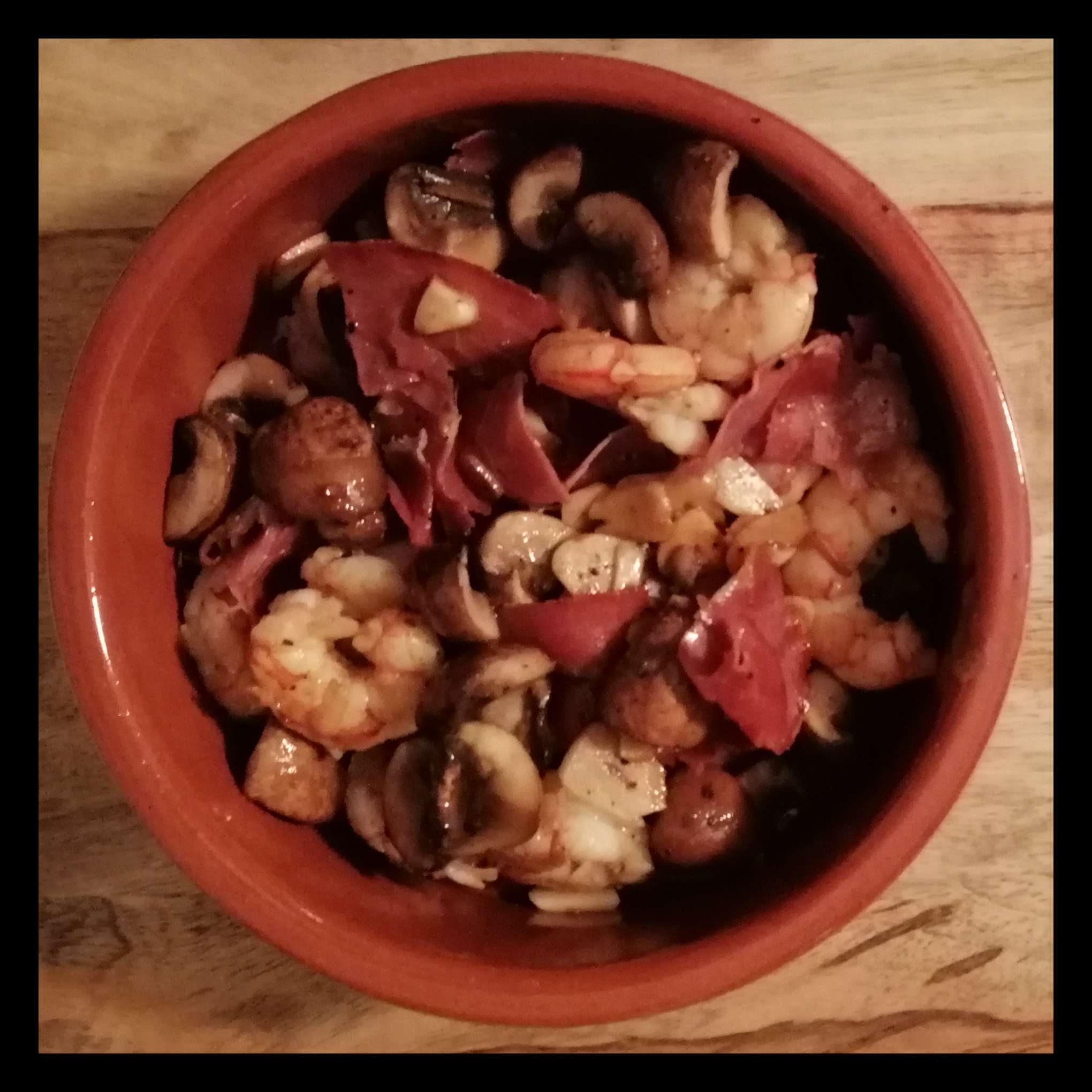 1 geh. EL Butter mittelstark erhitzen und die Champignons darin unter Wenden ca. 3 Min. anbraten, dann Schinken, Knoblauch und Langostinos hinzufügen und weiter ca. 3 Min. unter häufigem Wenden braten, mit
