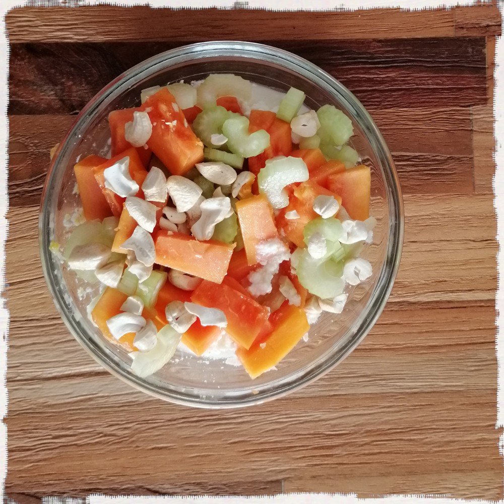 1 Scheibe Papaya (ca. 140 g – ohne Schale und Kerne ca. 90 g) in Stücke schneiden, beides auf den Ricotta geben und
