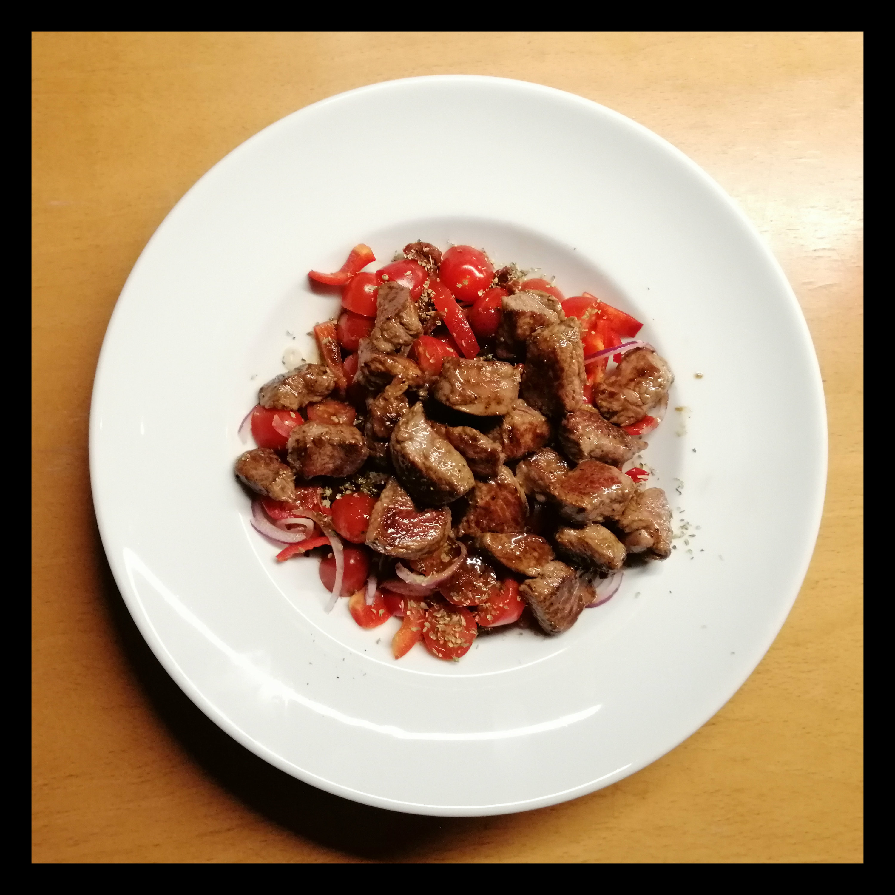 2 – 3 EL Brat-Olivenöl von beiden Seiten kurz scharf anbraten, beiseitestellen und zum Schluss alle alle Steakstreifen in der Pfanne miteinander mischen, mit