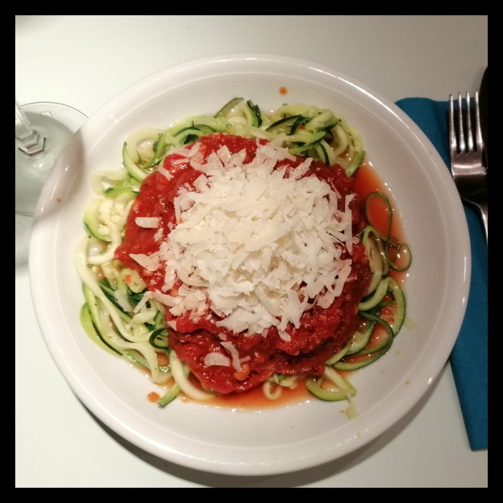 2 Zucchini (500 g) mit dem Spiralschneider in Spaghetti verarbeiten,