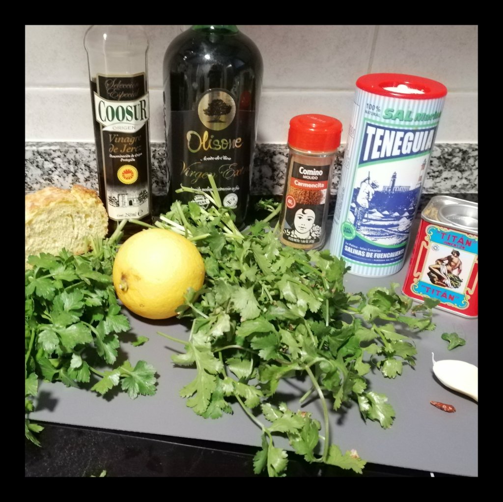 kalte Soße, prima zu gegrilltem oder gebratenem Fisch/Fischfilets oder auch als Dip für Papas arrugadas – kanarische Runzelkartoffeln (siehe Rezept vom 7. Januar 2020) oder Nachos, zu Fisch reicht es für 4 – 6 Personen, zu den Kartoffeln für 2 – 3, wenn es keine Mojo pricón (rote Mojo) (siehe Rezept vom 29. März 2017) noch zusätzlich gibt