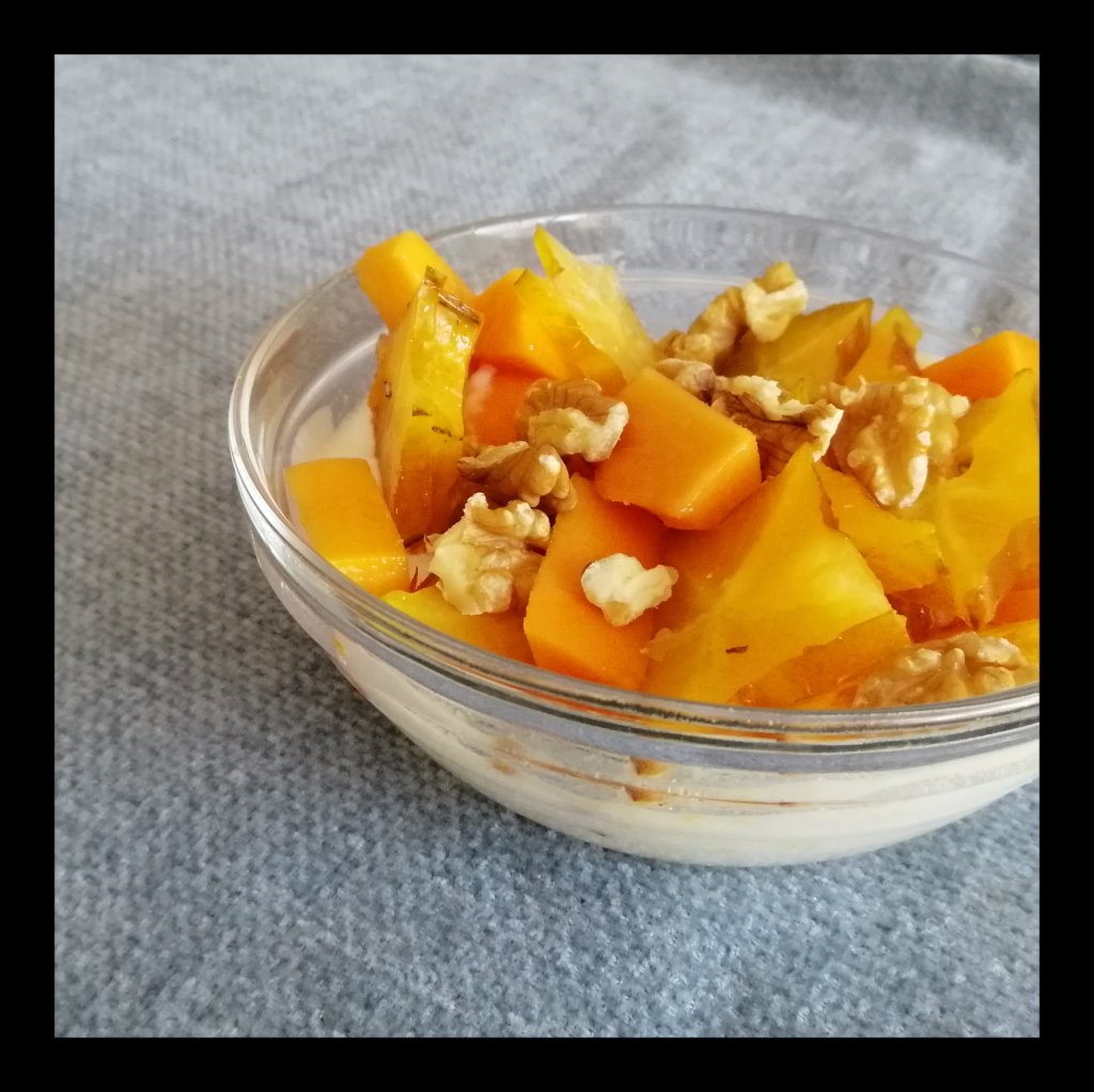 1 Scheibe Papaya (ca. 150 g) in Stücke schneiden, beides auf den Joghurt geben und