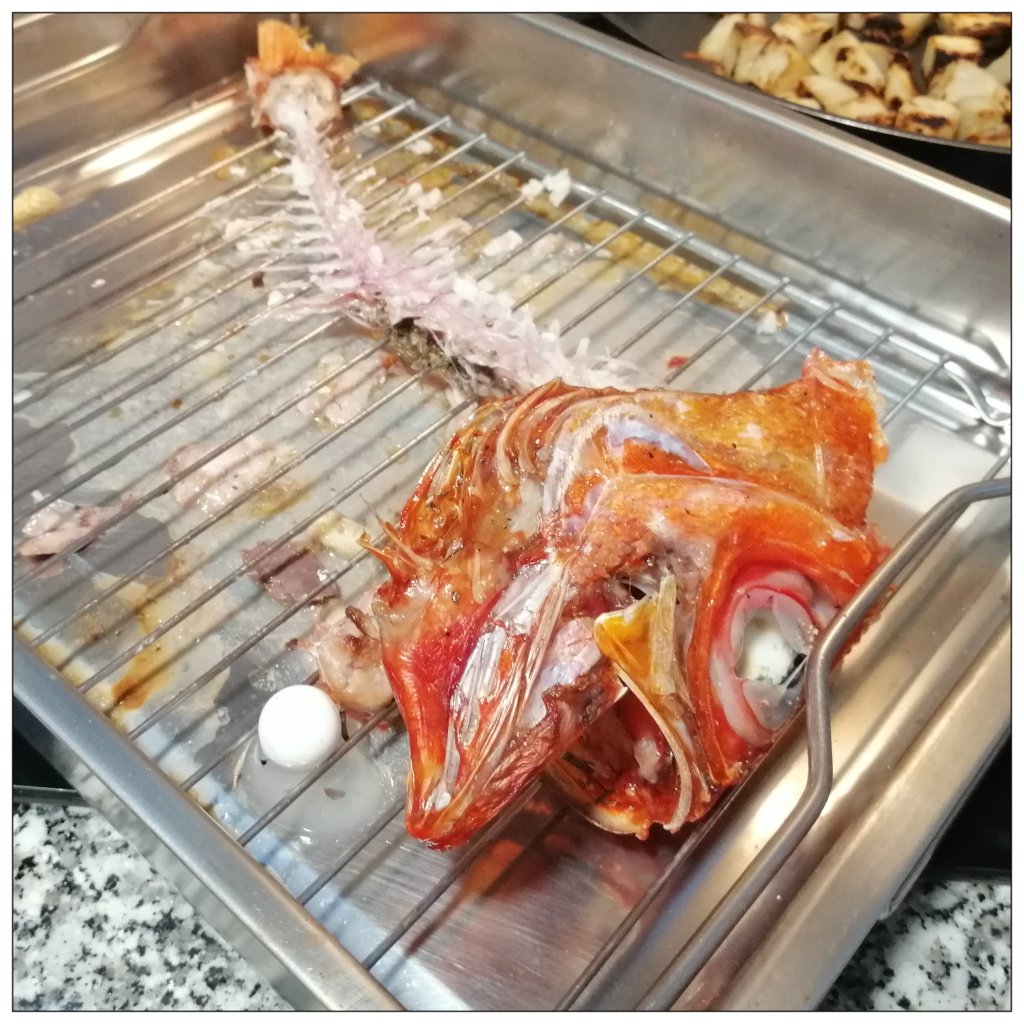 1 Alfonsino (Kanarischer Fisch, ca. 1,0 kg – küchenfertig, vom Fischer mit zwei schrägen seitlichen Schnitten versehen) zuerst mit den aufgeschnittenen Seiten von
