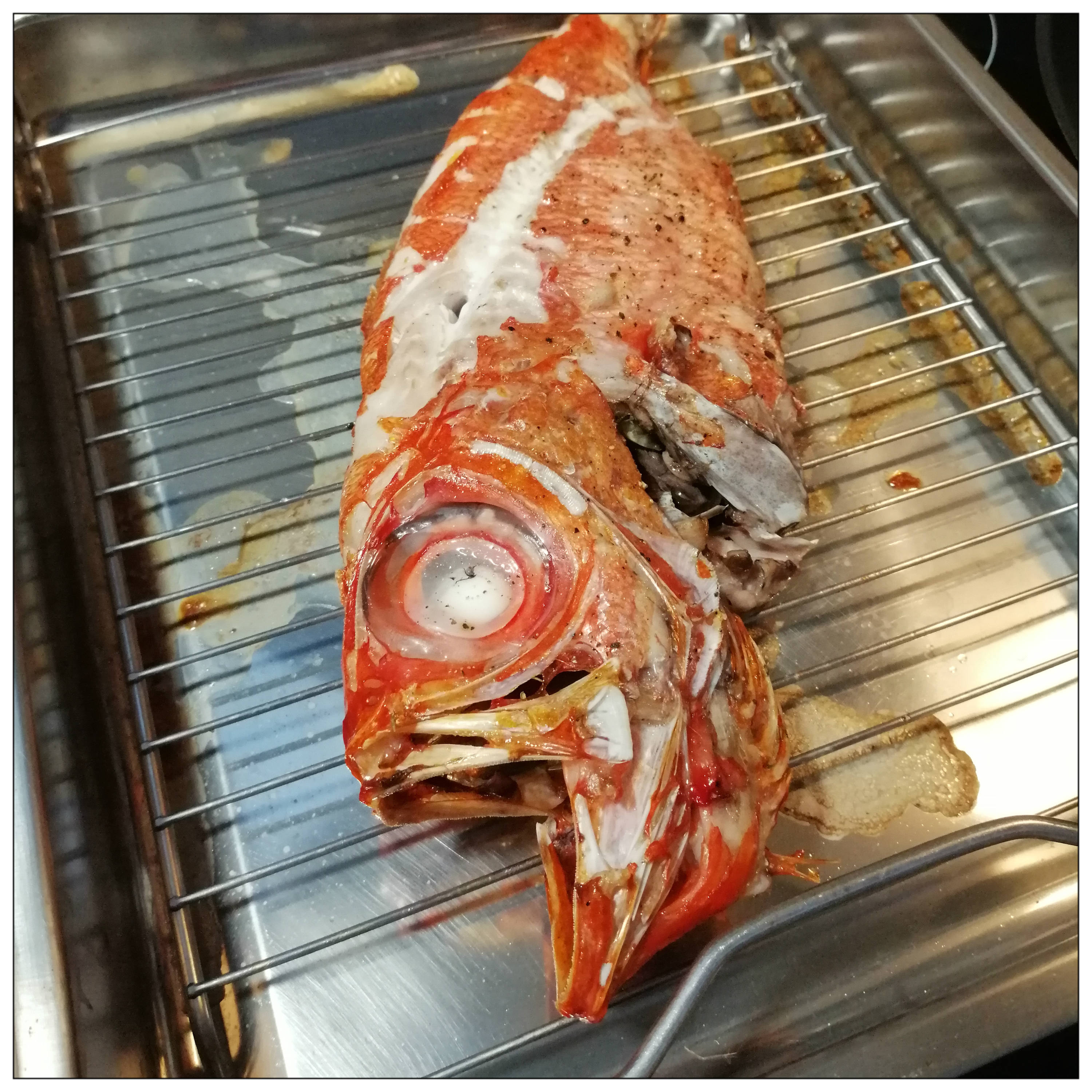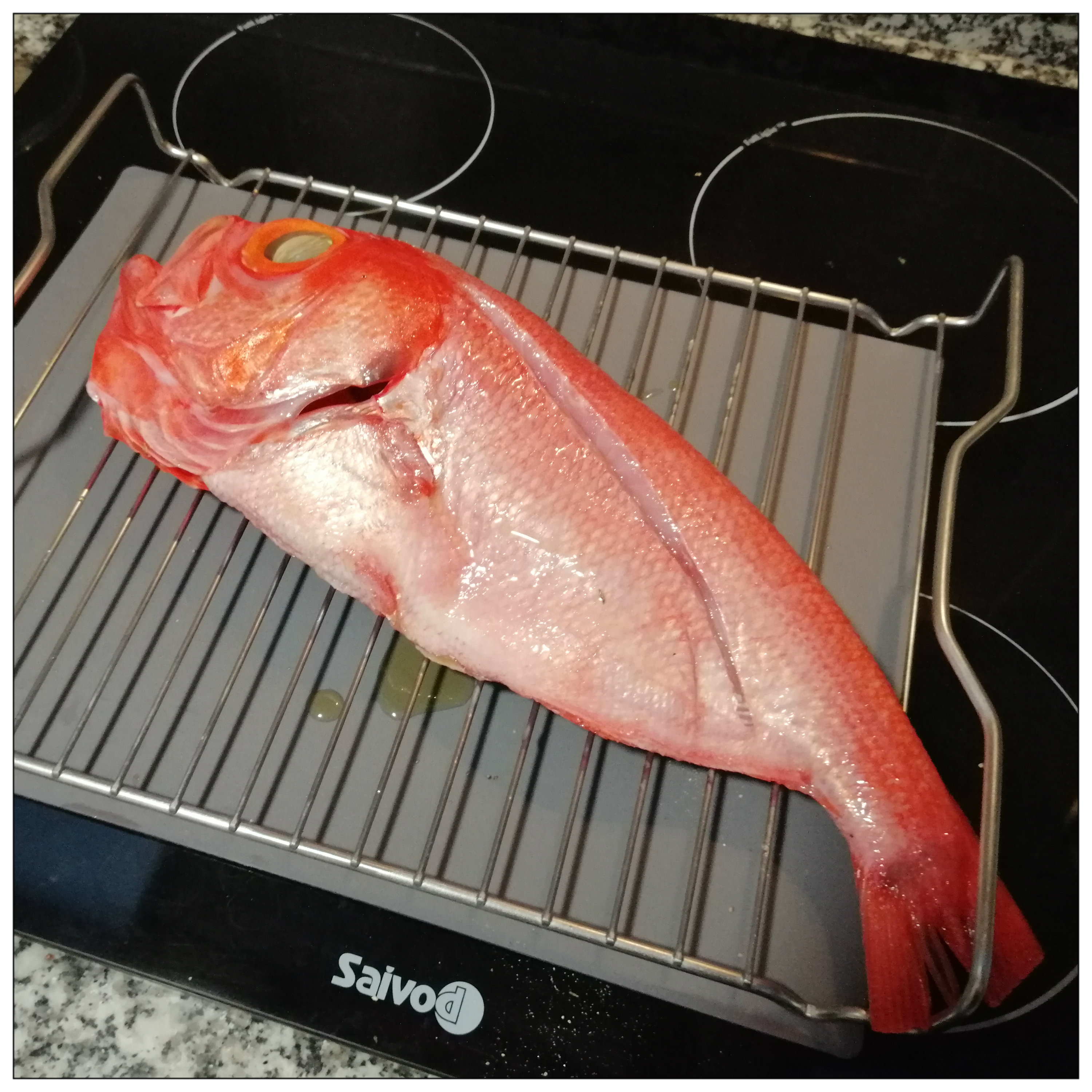1 Alfonsino (Kanarischer Fisch, ca. 1,0 kg – küchenfertig, vom Fischer mit zwei schrägen seitlichen Schnitten versehen) zuerst mit den aufgeschnittenen Seiten von