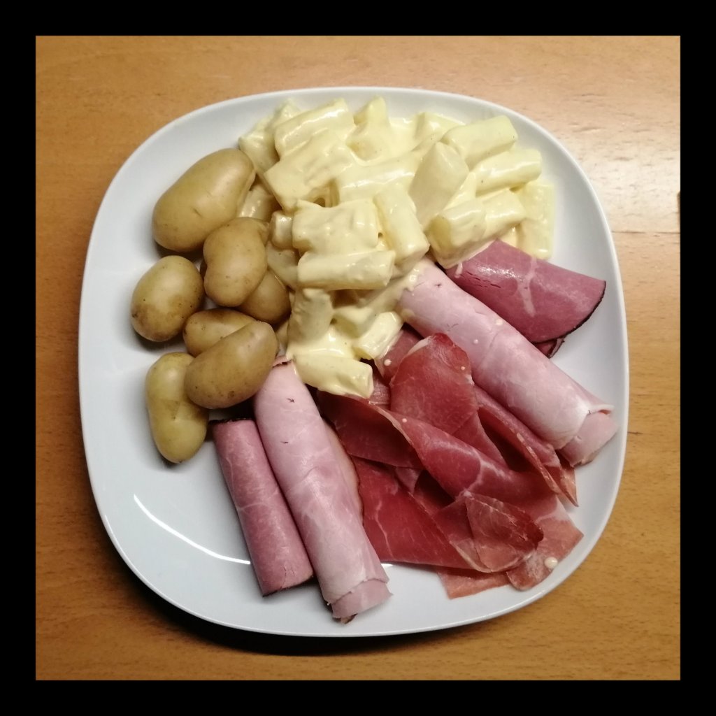 400 g Schinken (z. B. gek. Wacholderschinken, Rindersaftbraten, luftgetrockneten Holsteiner Schinken (in nicht zu dünne Scheiben geschnitten) auf den vorgewärmten Tellern verteilen, dabei Platz für Kartoffeln und Spargel lassen,