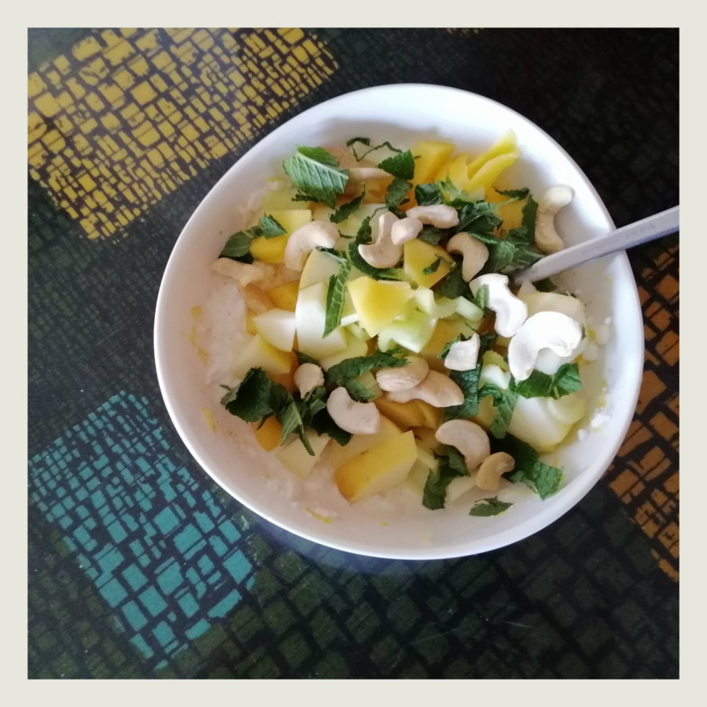 12 Cashewkerne leicht zerkleinern, alles mit den gehackten Blättchen von