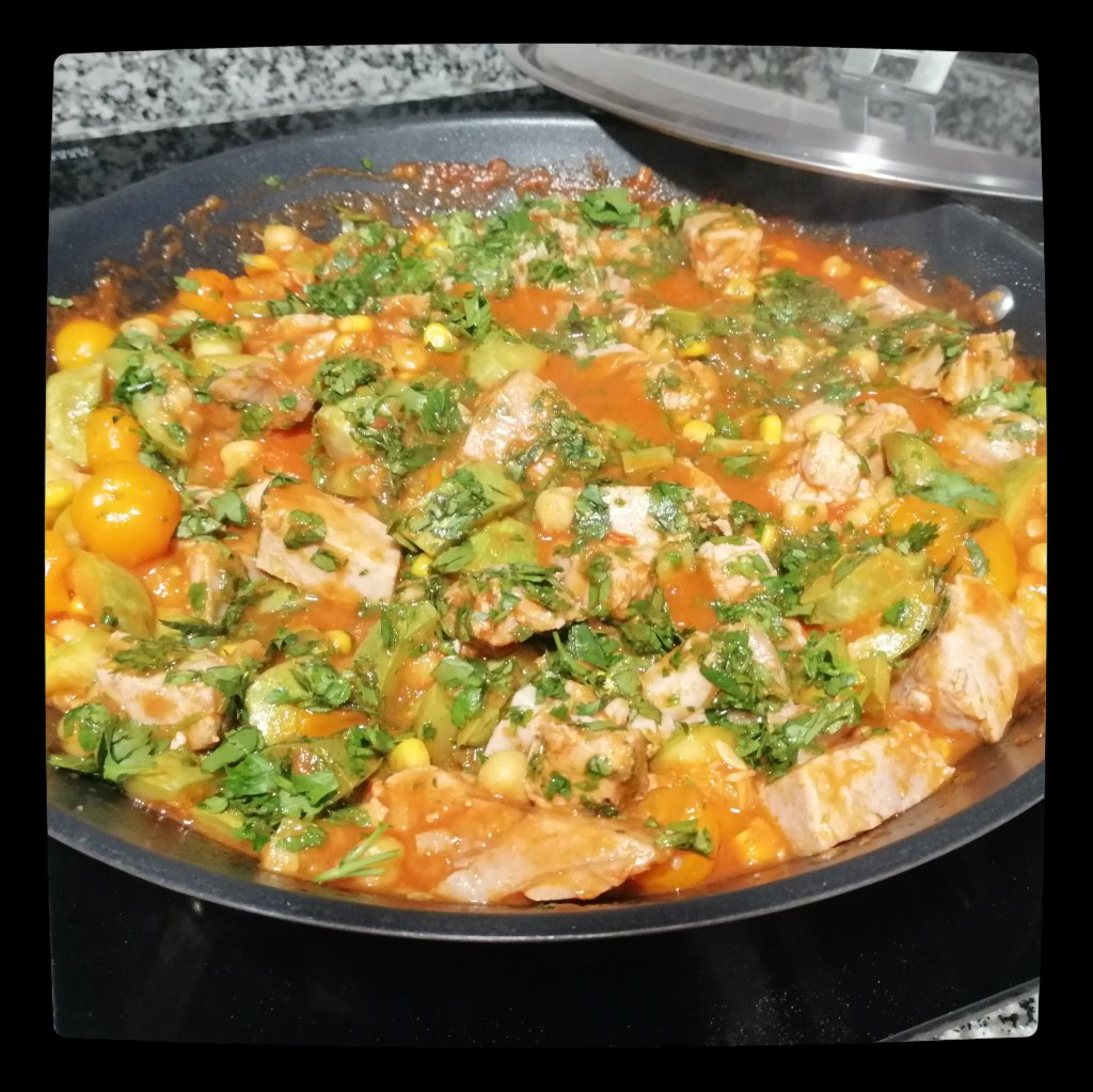 100 ml trockenen Weißwein unter die Gemüsemischung rühren, erhitzen und kurz köcheln lassen, dann den Mais hinzufügen und noch einmal kurz köcheln lassen, nun die Fisch-Stücke und