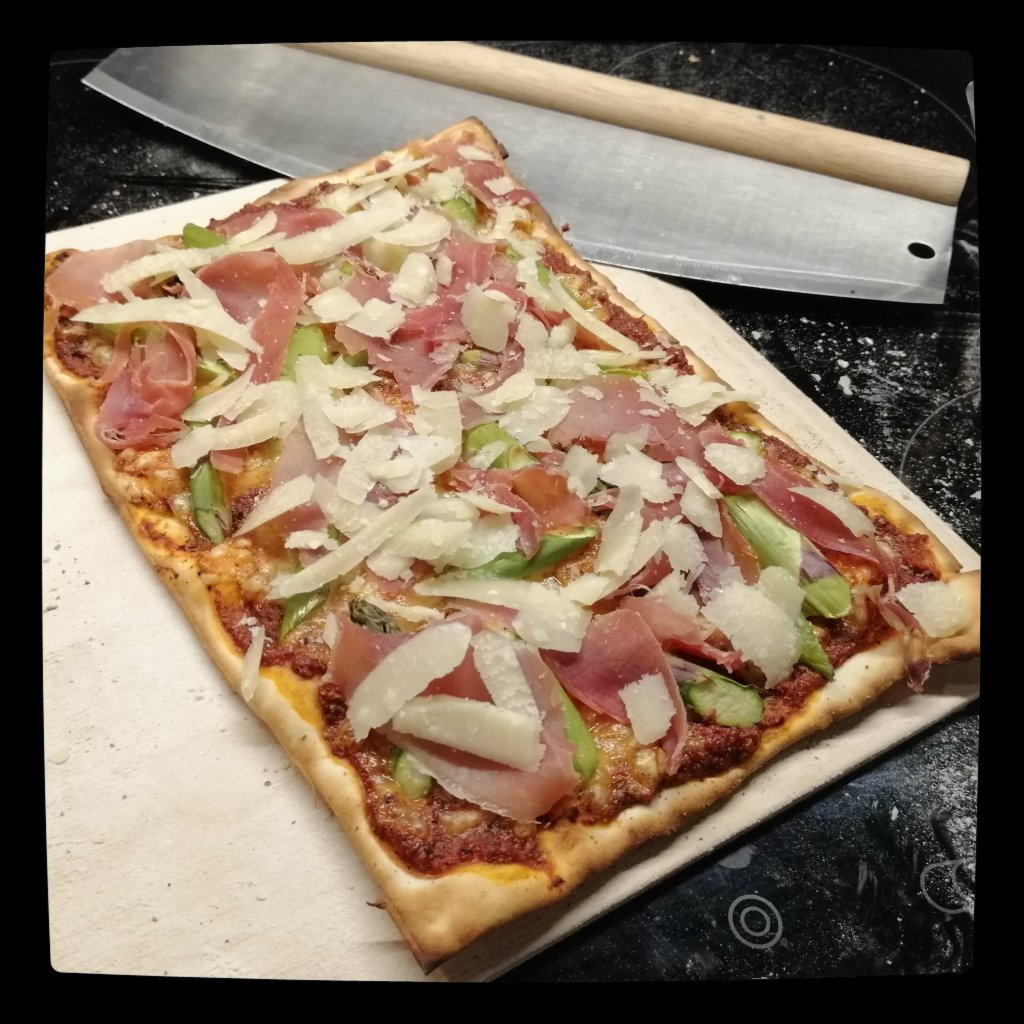 bemehlten Pizzaschieber legen, mit der Tomatensauce bestreichen und den Emmentaler darauf verteilen, dann mit dem Spargel belegen und mit