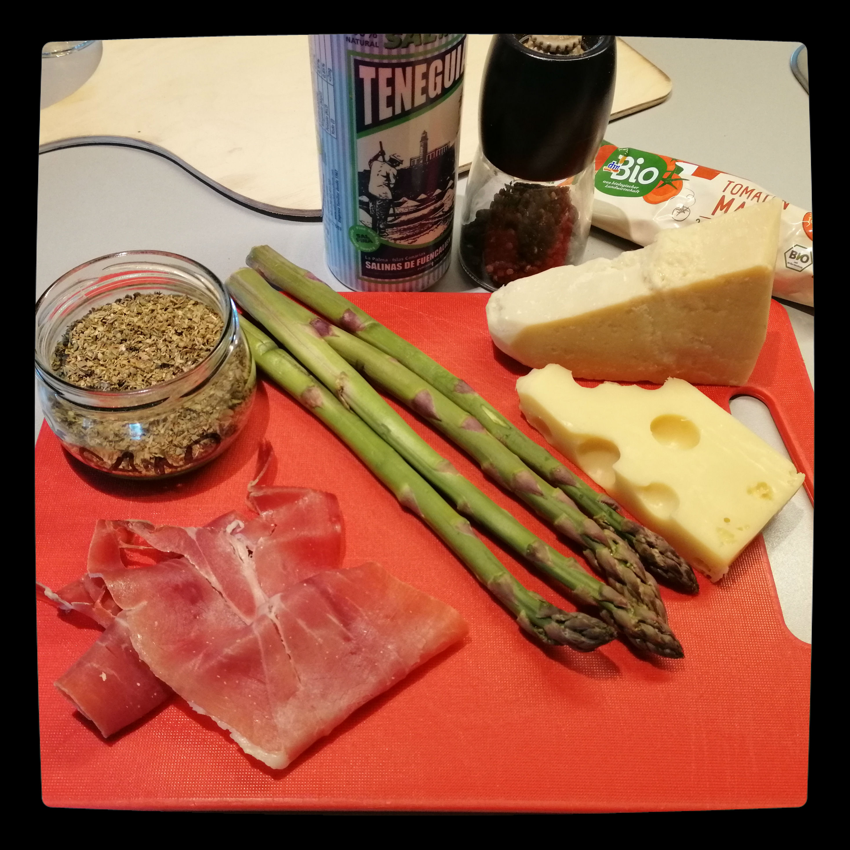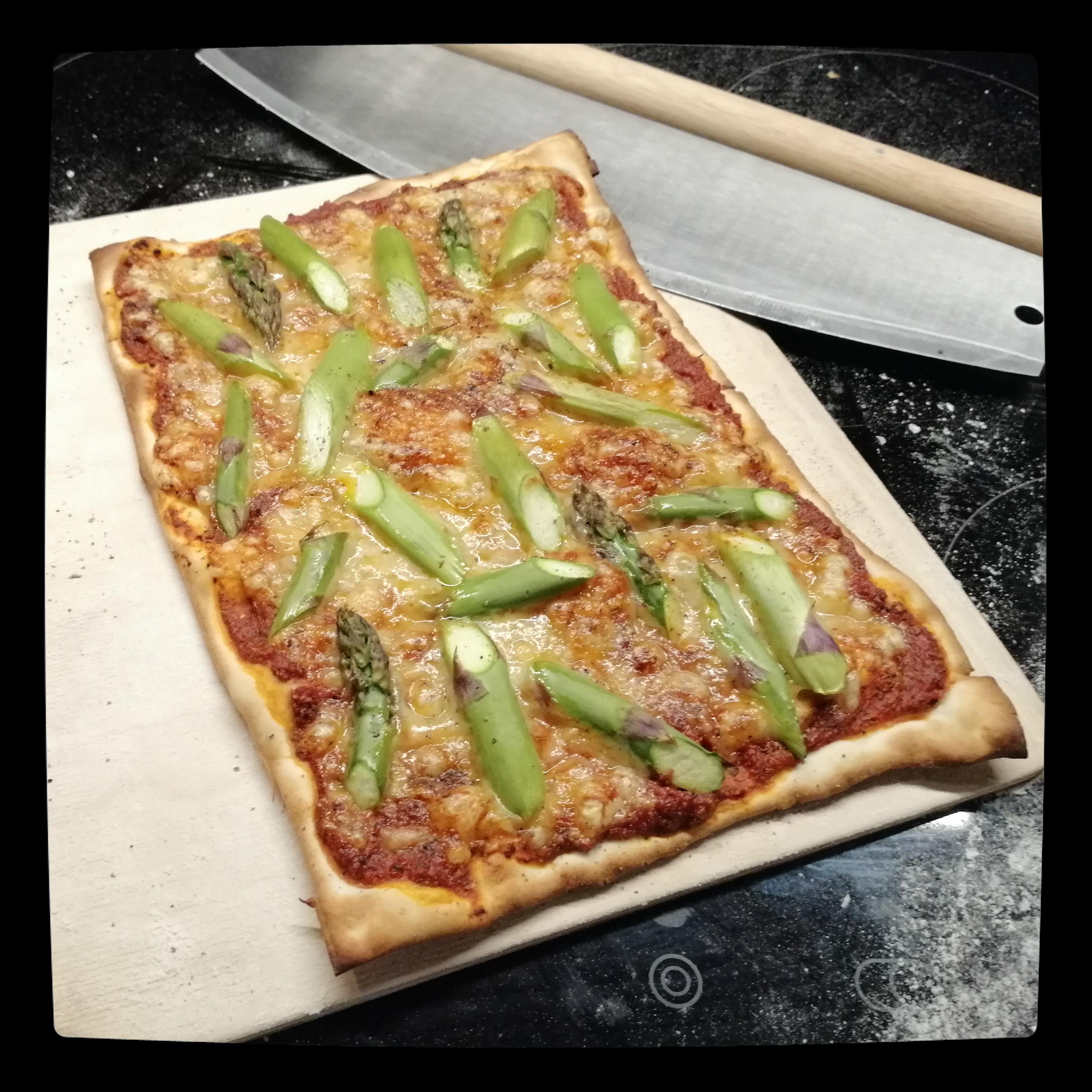bemehlten Pizzaschieber legen, mit der Tomatensauce bestreichen und den Emmentaler darauf verteilen, dann mit dem Spargel belegen und mit
