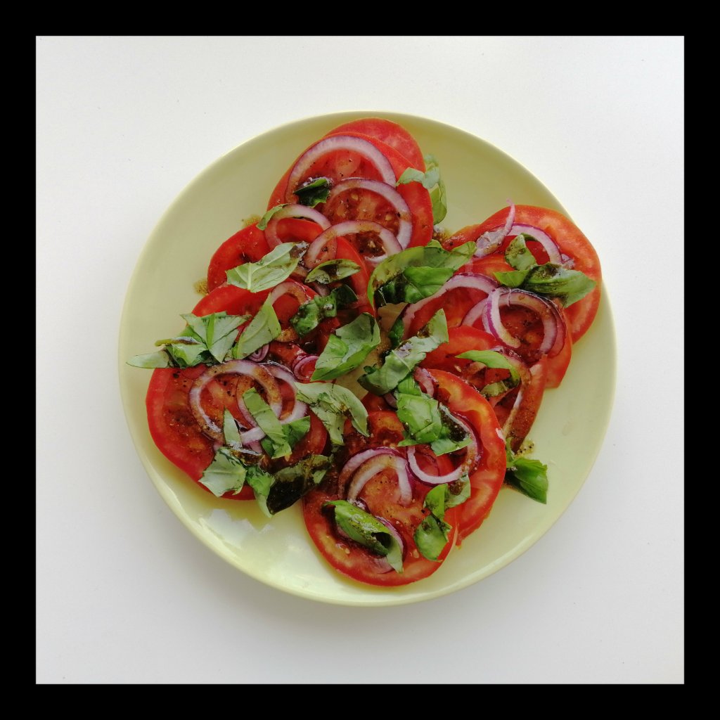 ca. 6 Basilikum-Blätter (je nach Größe und Geschmack) zerkleinern, alles auf einem Teller anrichten und mit einem Dressing aus