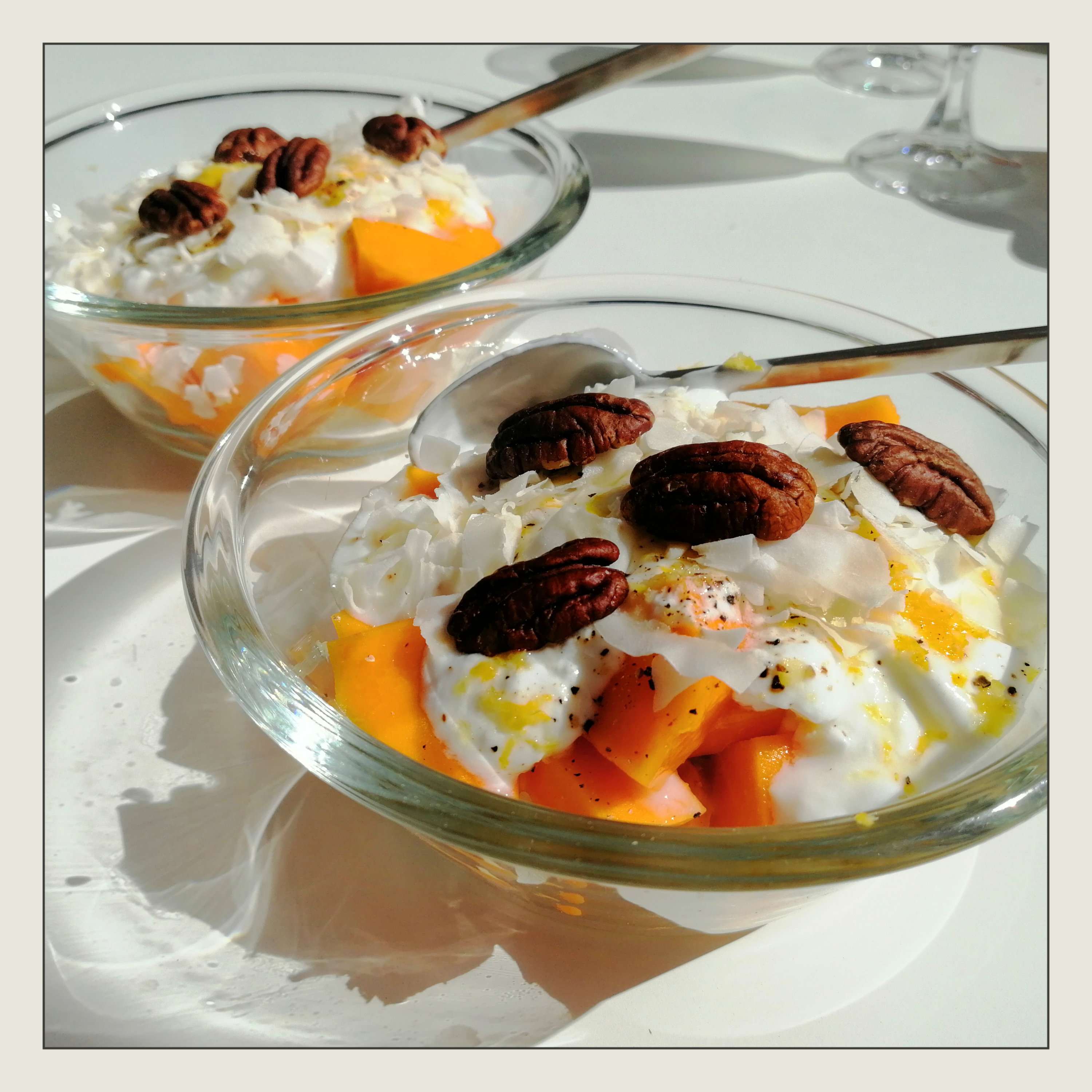 1 Scheibe Papaya (ca. 150 g – in Stücke geschnitten) auf zwei kleine Schüsseln verteilen,