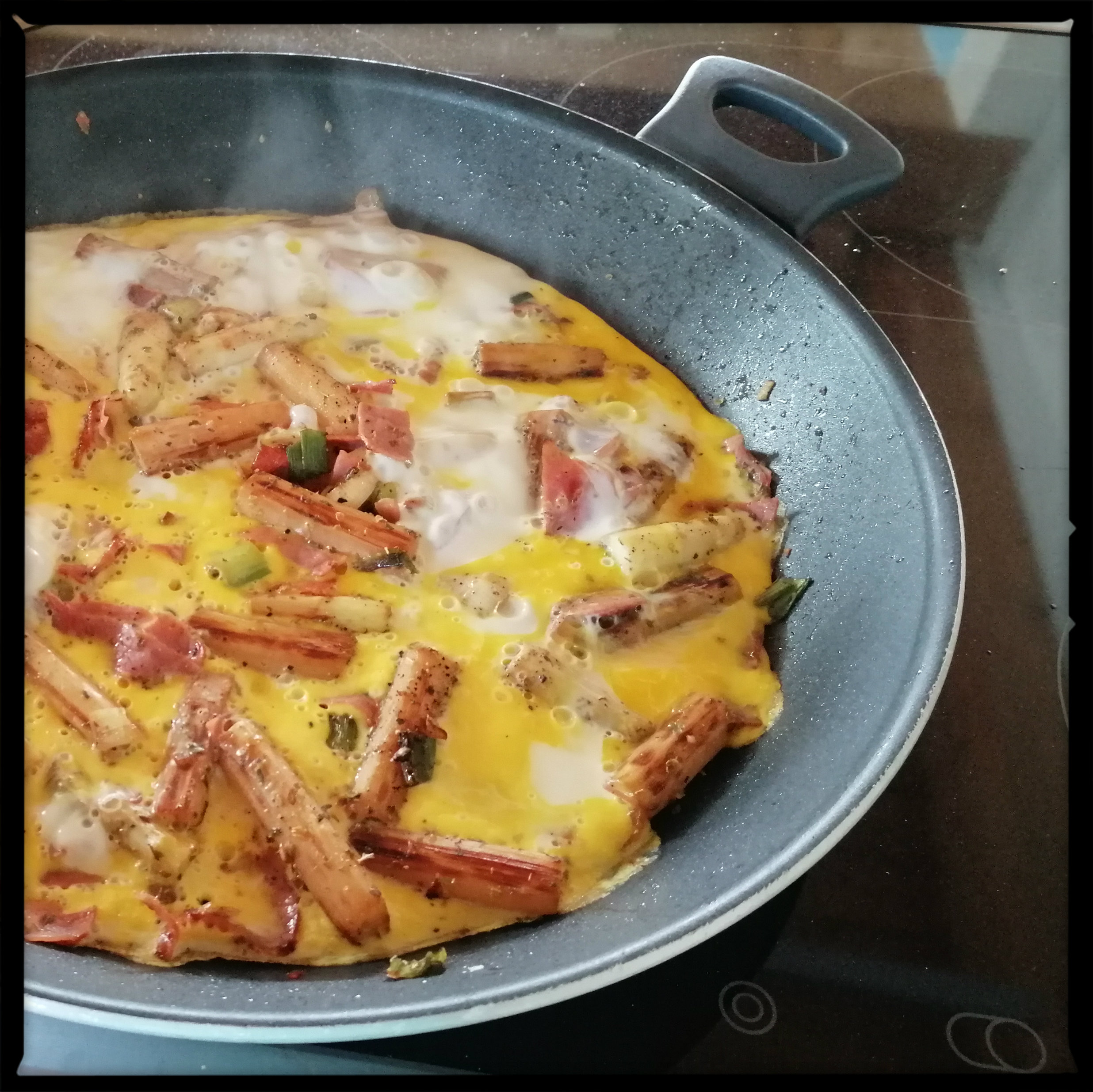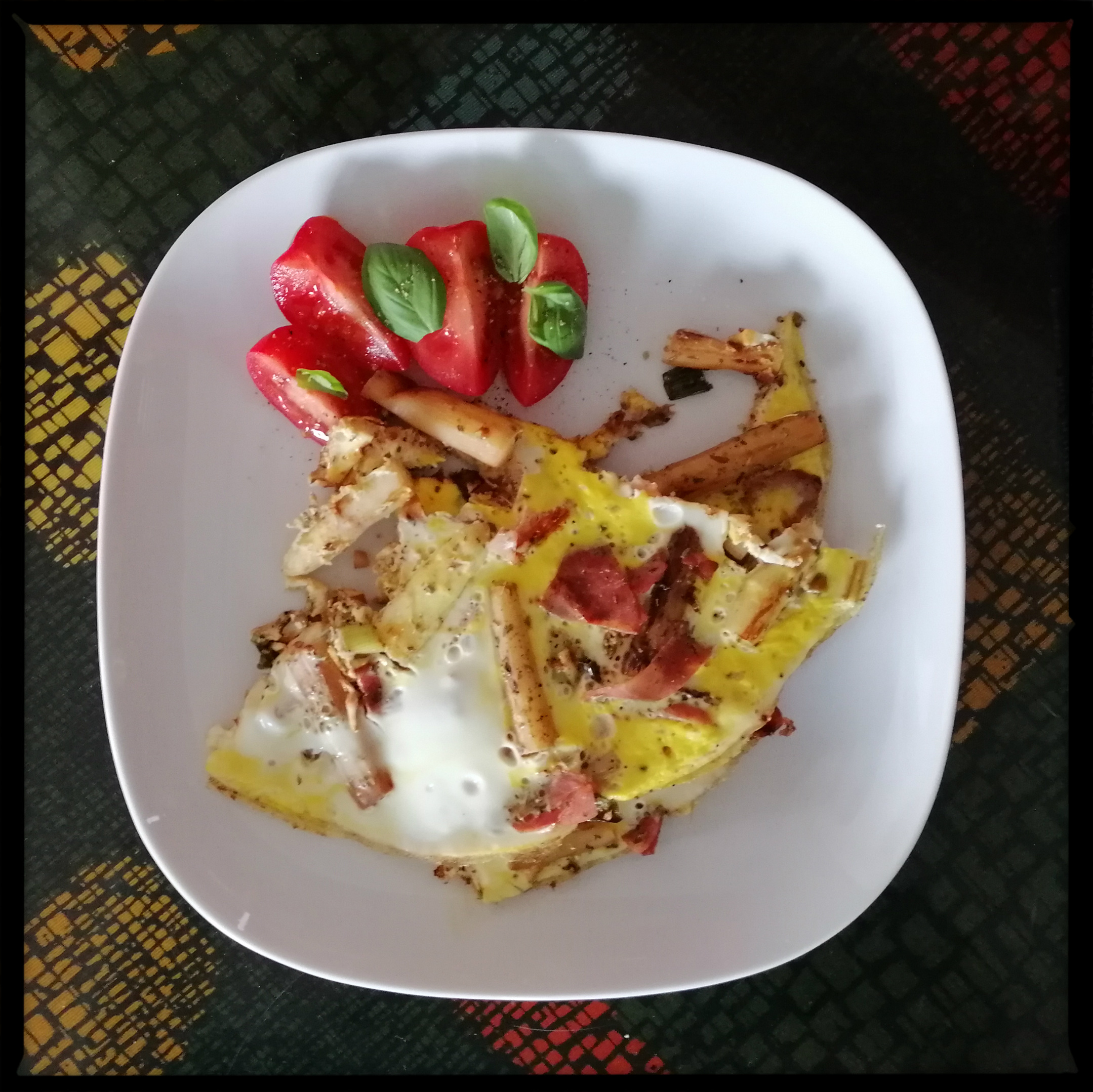 den Schinken unter den Spargel mischen und die Eier darübergießen und ggf. noch verteilen, dann