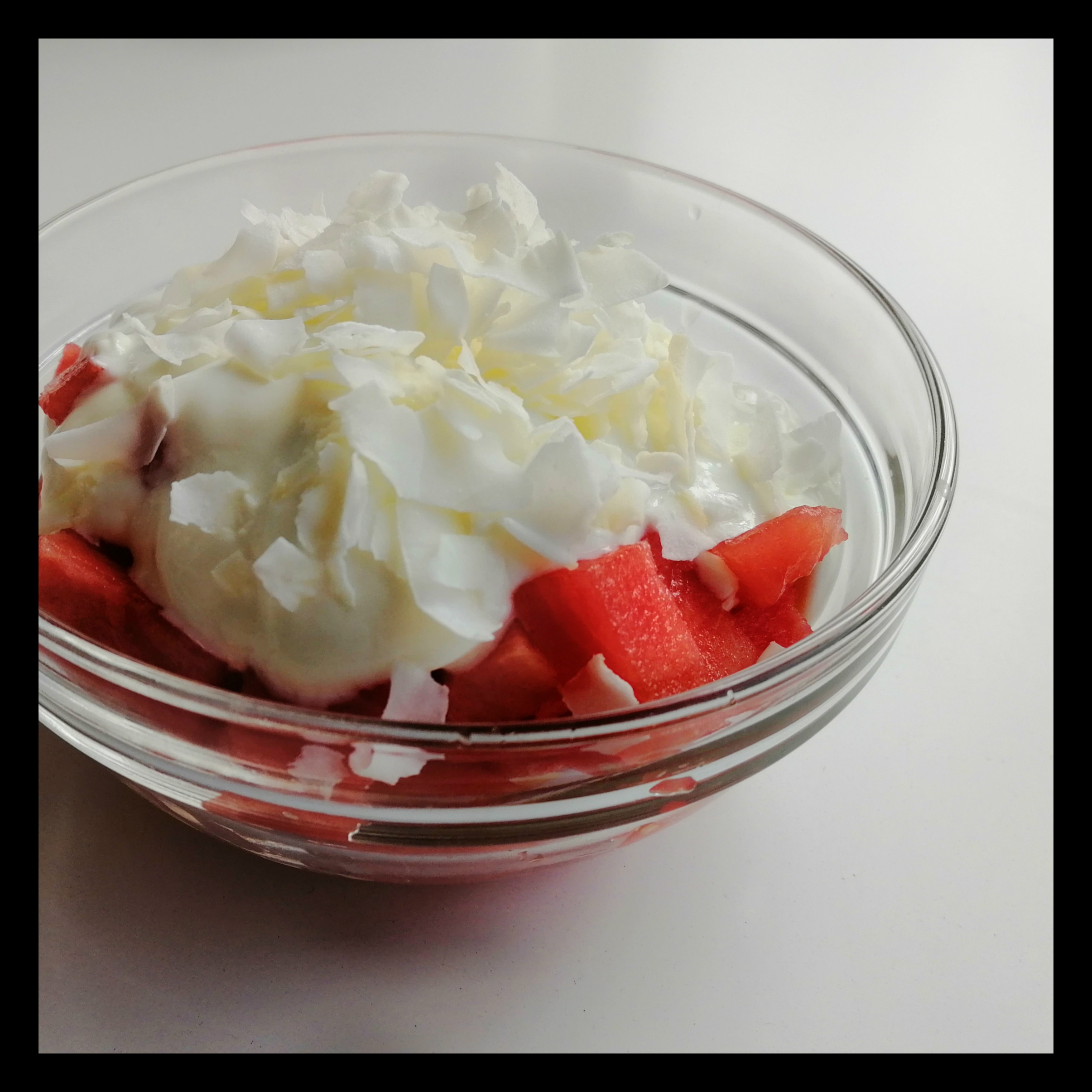 1/8 kl. Wassermelone (ca. 120 g Fruchtfleisch) in kleine Stücke schneiden und in eine kleine Schüssel geben,