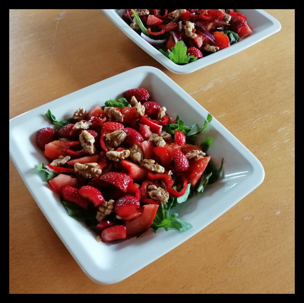 100 g Erdbeeren (möglichst kleine – je nach Größe geviertelt oder halbiert) auf dem Salat verteilen und alles mit den Walnüssen bestreuen