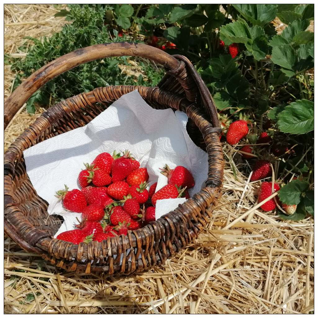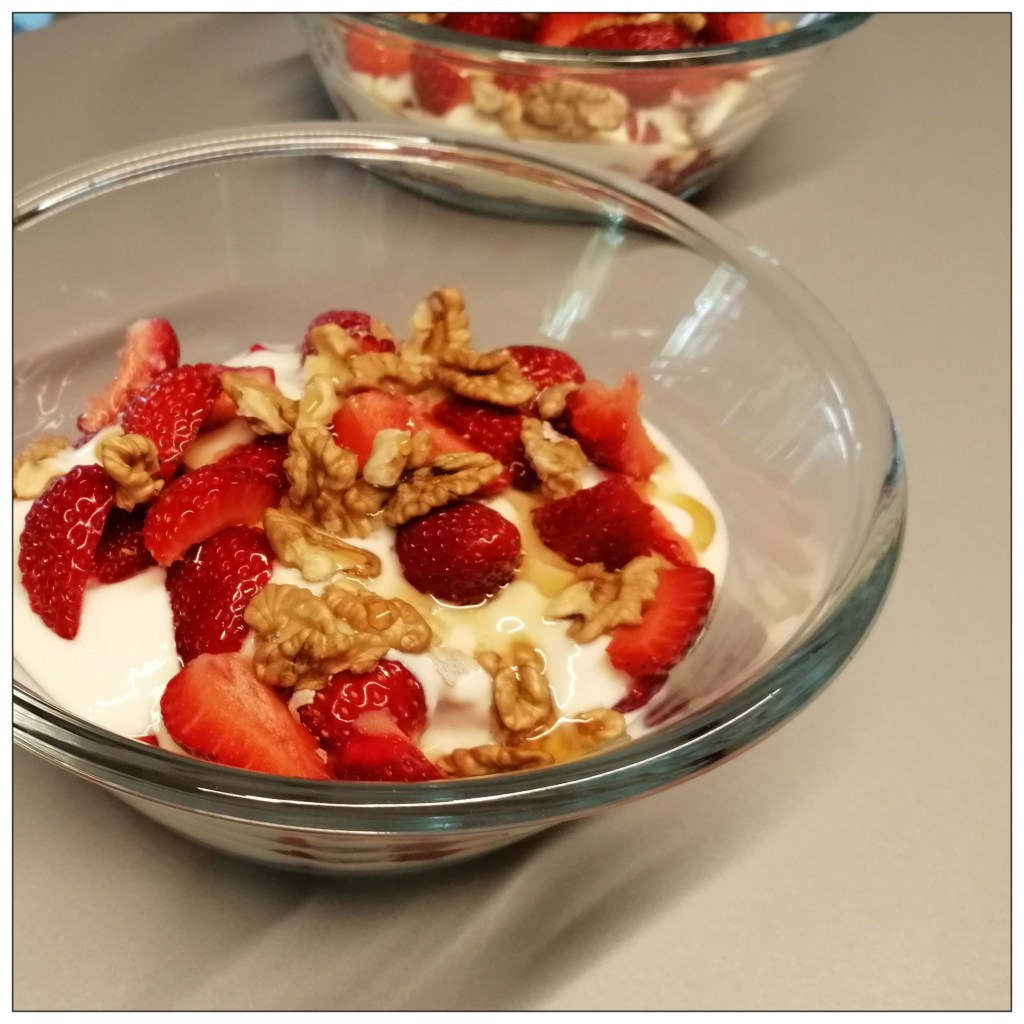 200 g Joghurt (3,8 % Fett) darüber geben und anschließend die restlichen Erdbeeren auf dem Joghurt verteilen, alles mit
