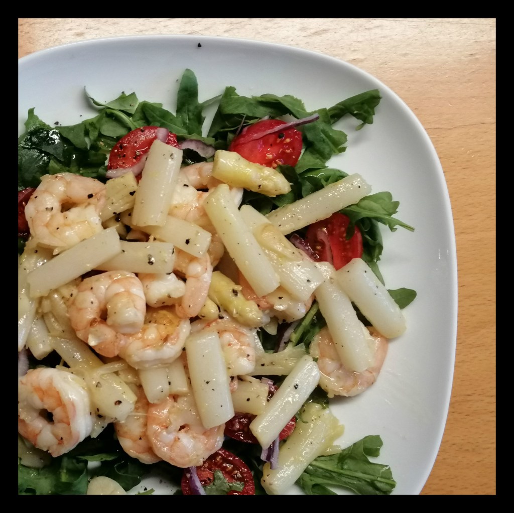 etwas Salz ca. 10 Min. unter mehrfachem Wenden garen, dann die Spitzen hinzufügen und – je nach Dicke der Stangen – noch weitere 8 – 15 Min. garen (der Spargel sollte noch bissfest sein), derweil