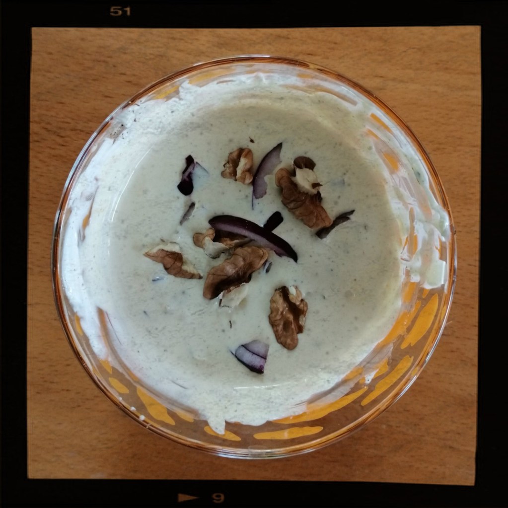 1 TL Currypulver verrühren, dann Zwiebeln und Walnüsse locker untermischen