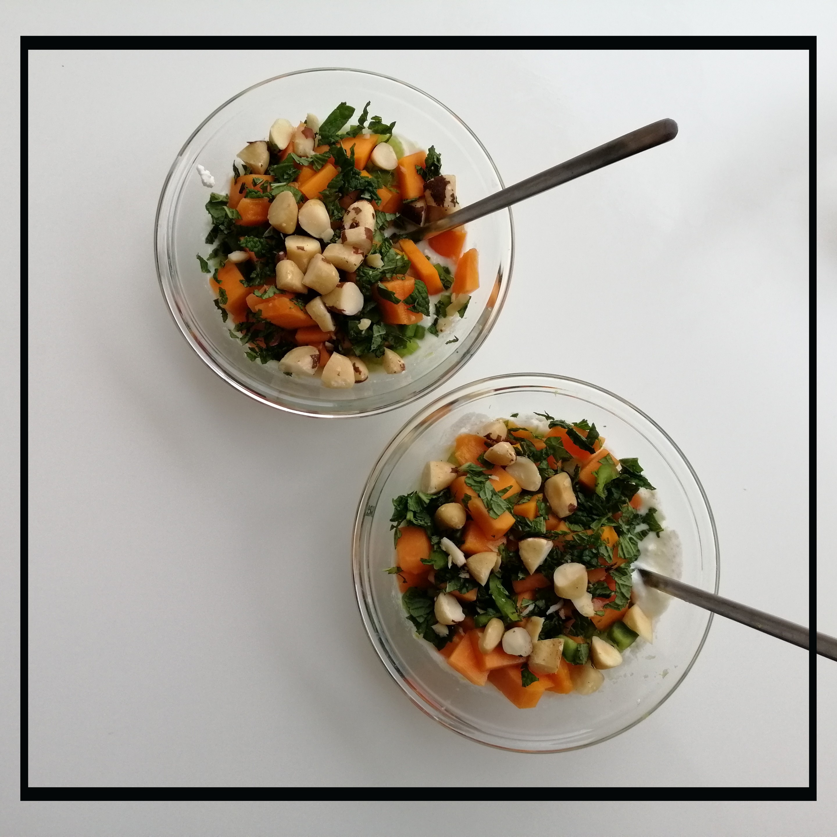 240 g Papaya in kleine Stücke schneiden, alles auf die beiden Schüsseln verteilen, mit