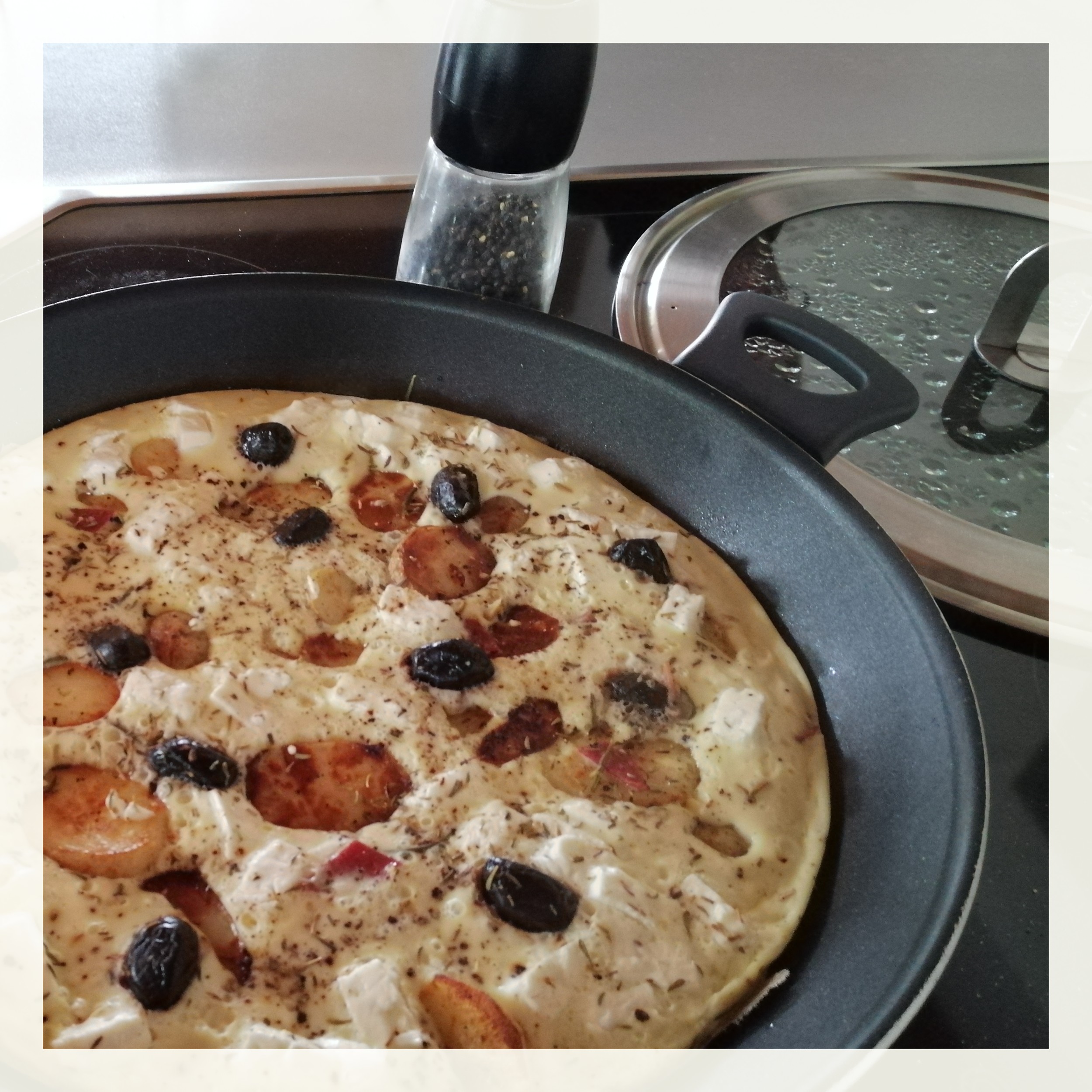 12 griechische schwarze trocken eingelegt Oliven darauf verteilen, die Pfanne sofort mit dem Deckel schließen, nach ca. 3 Minuten die Hitze auf mittelschwach reduzieren und das Omelett so lange braten, bis auch die Oberfläche gestockt ist – je nach Pfannengröße unterschiedlich, etwa 5 Minuten