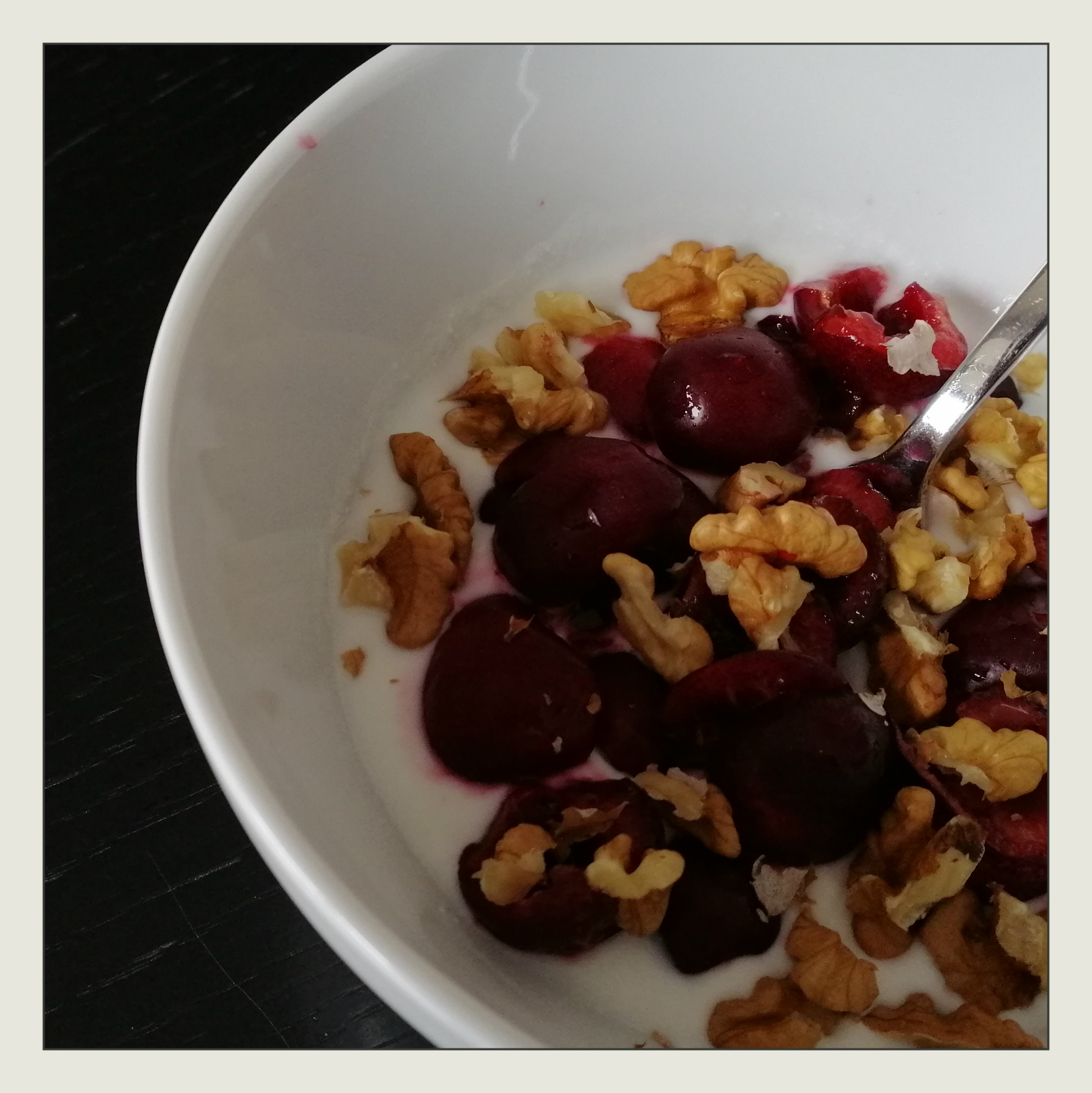 2 Handvoll Süßkirschen (entsteint) leicht mischen und