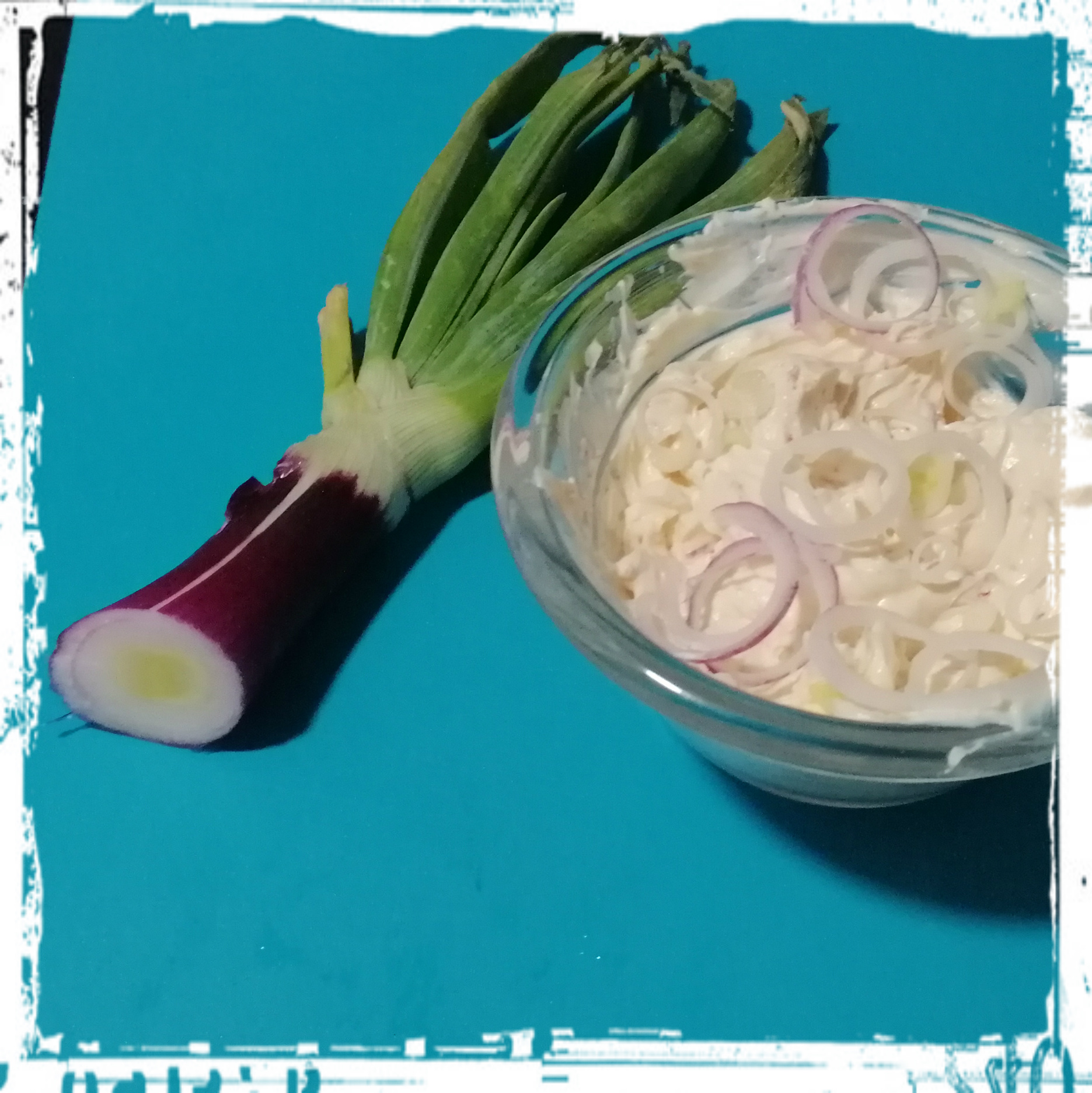 1/2 dicke rote Frühlingszwiebel (das untere Ende) in dünne Ringe schneiden,