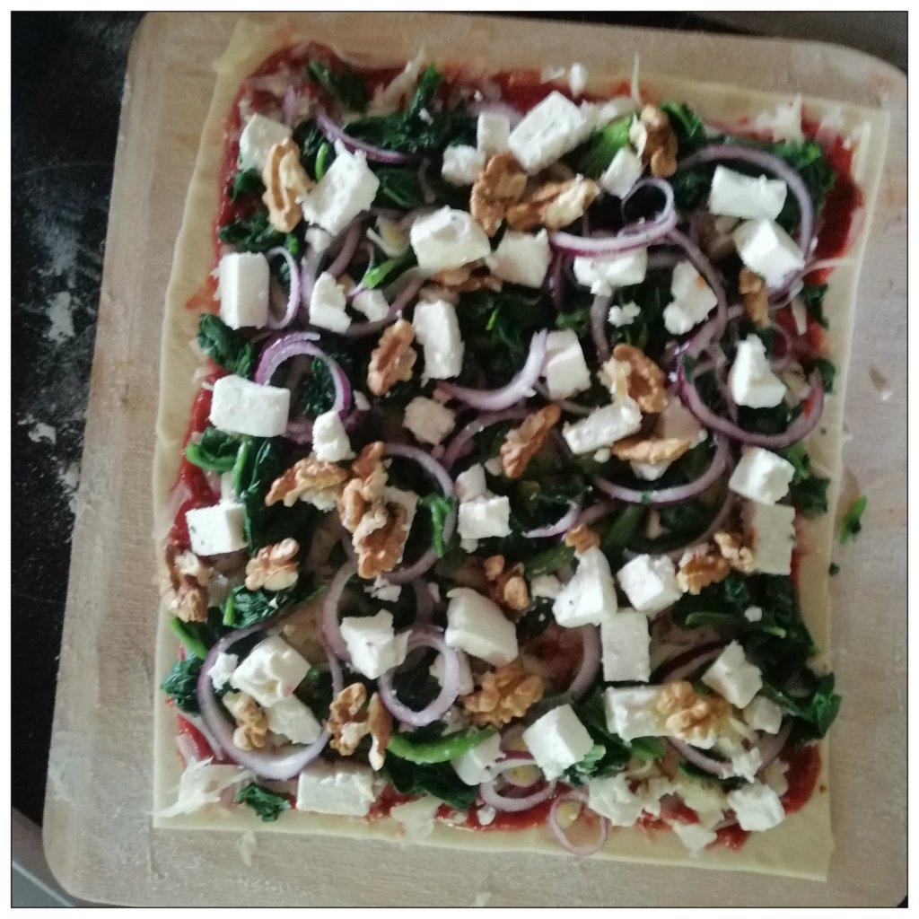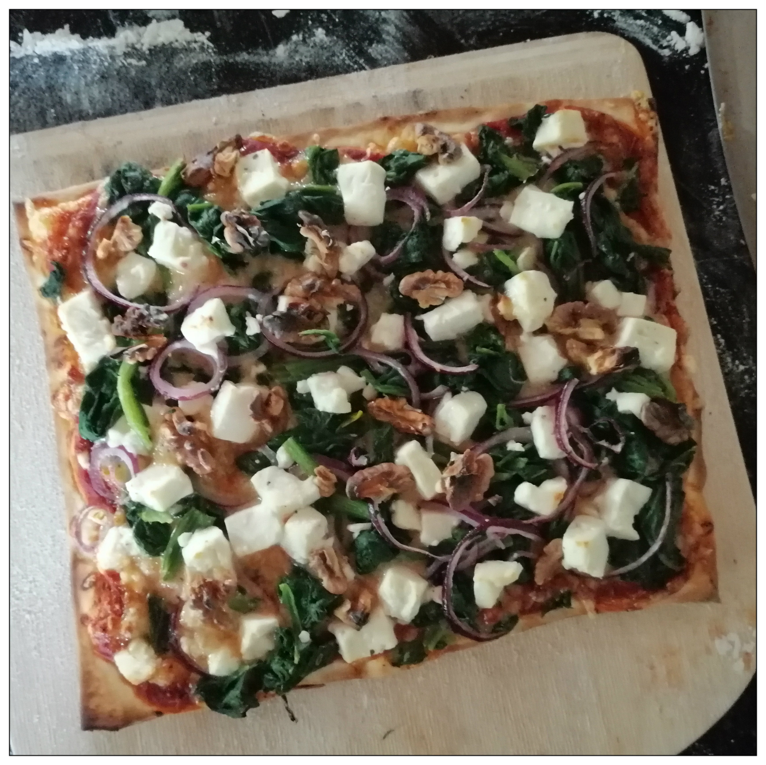 bemehlten Pizzaschieber mit der Tomatensauce bestreichen, den Spinat (in Küchenkrepp gut ausgedrückt), die Zwiebeln, den Feta und die Walnüsse darauf verteilen, alles mit