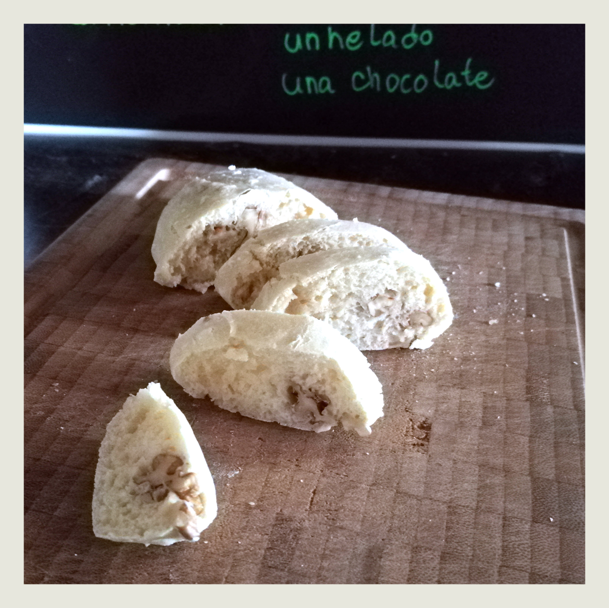 insgesamt 120 g Walnusskernen (nur leicht zerkleinert) bestreuen, zusammenklappen, zu leicht länglichen Brötchen formen und auf ein mit