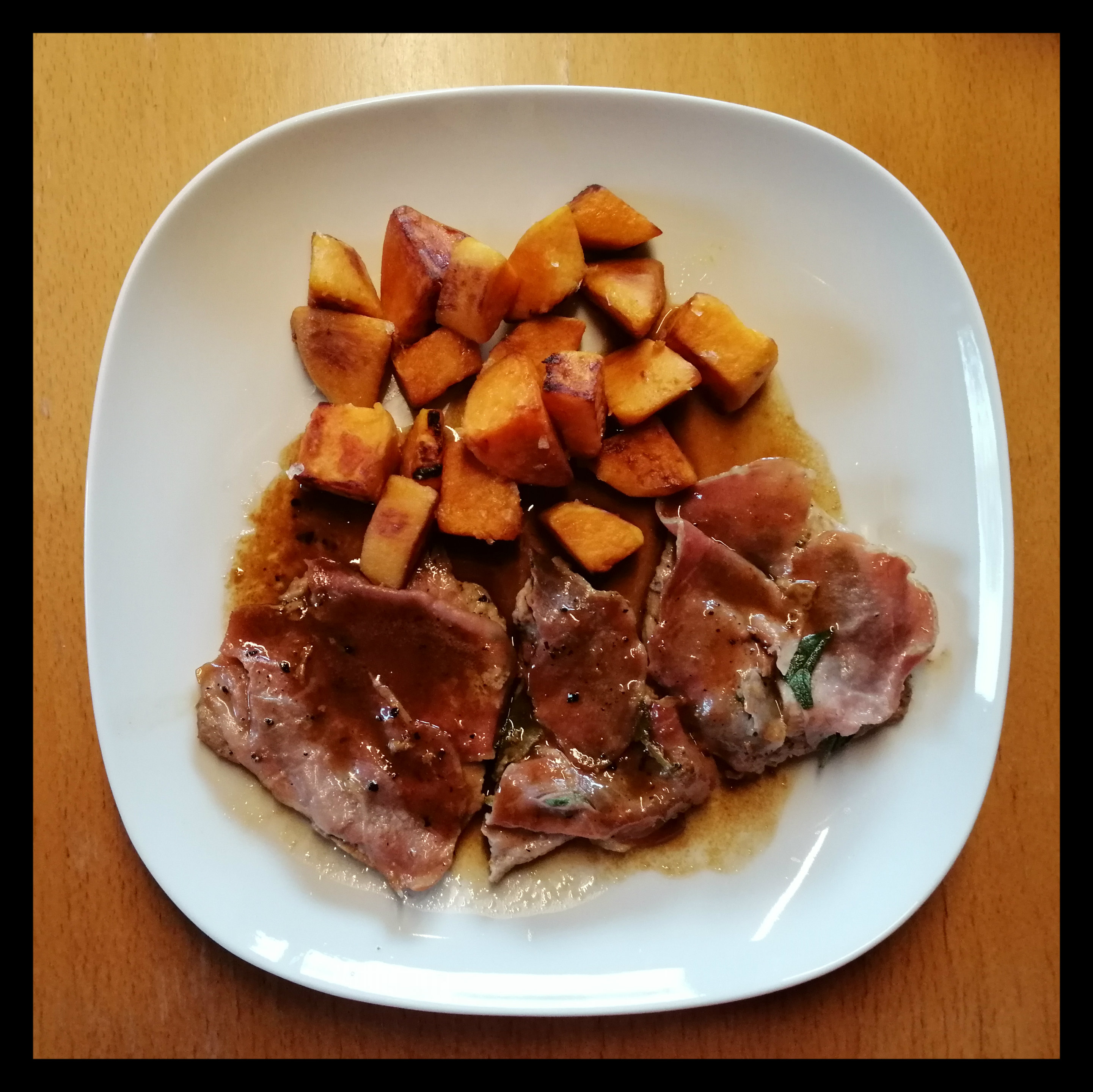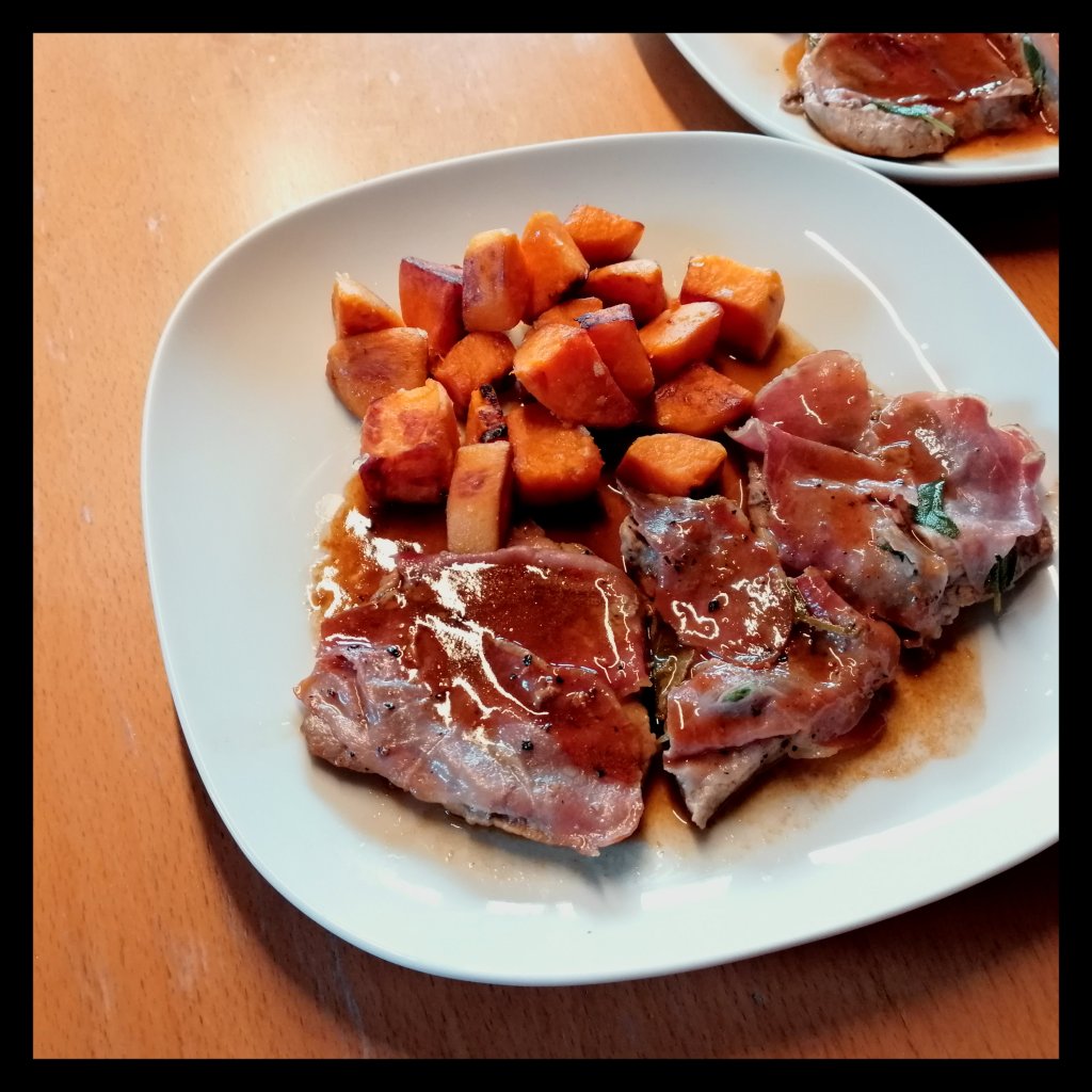 Süßkartoffeln und Schnitzel auf zwei vorgewärmten Tellern anrichten, die Sauce über die Schnitzel geben und alles z. B. mit dem Tomatensalat (Rezept siehe 22. Mai 2020) servieren