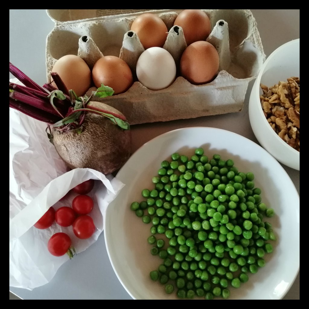 die Erbsen in der größeren Pfanne vorsichtig mit den roten Beten mischen und