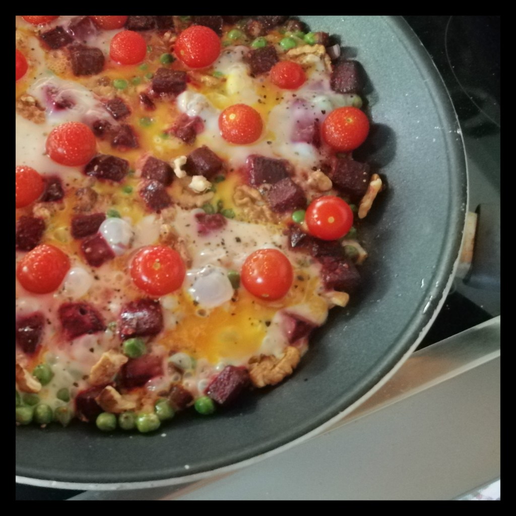 100 g Kirschtomaten darauf verteilen, die Pfanne mit dem Deckel schließen und die Eier in 3 – 5 Min. stocken lassen