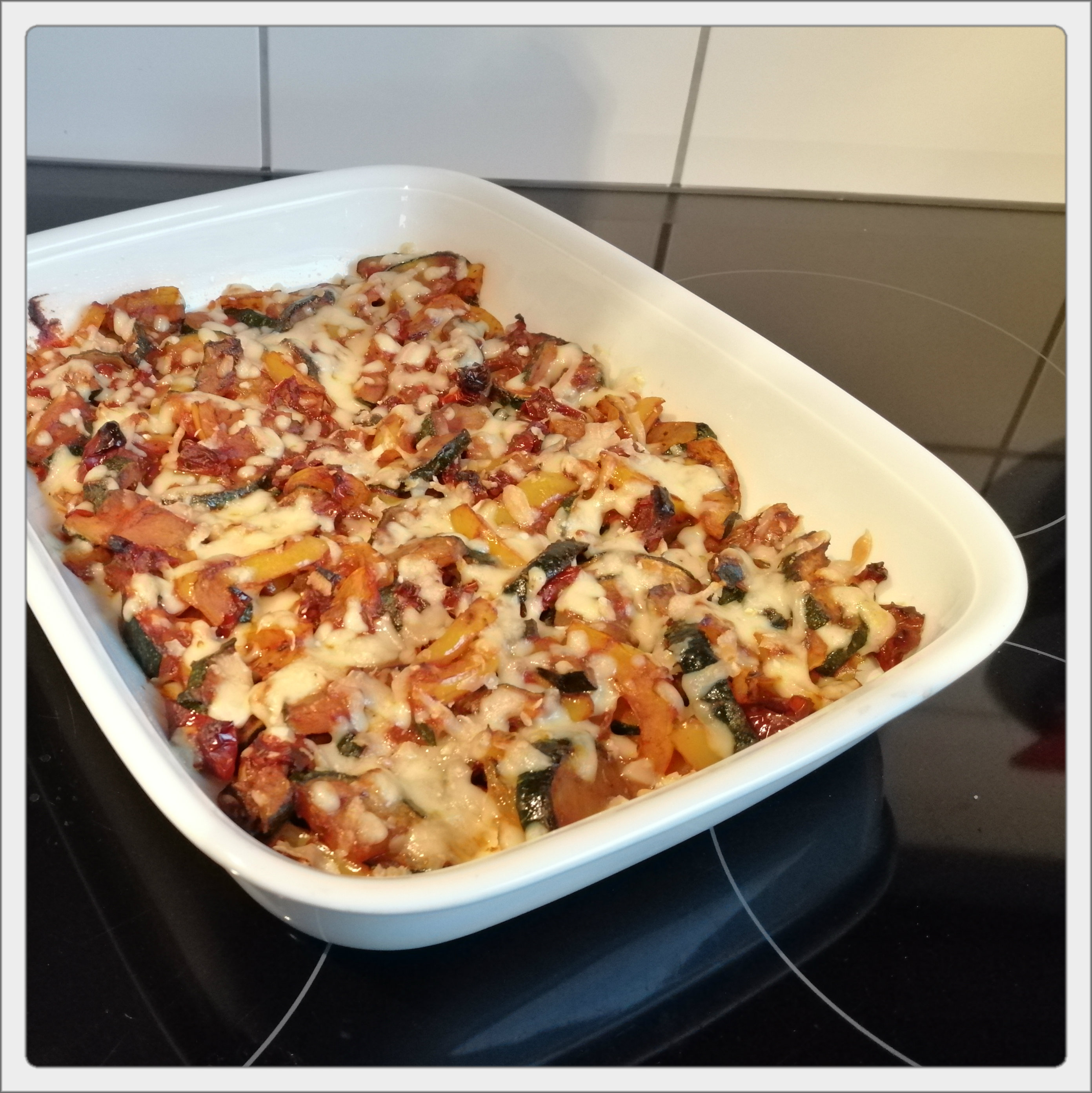 1 EL Brat-Olivenöl ausreiben, dann die Gemüsemischung hineingeben und den Käse darüberstreuen, im Backofen auf oberer Schiene 10 bis 15 Min. gratinieren