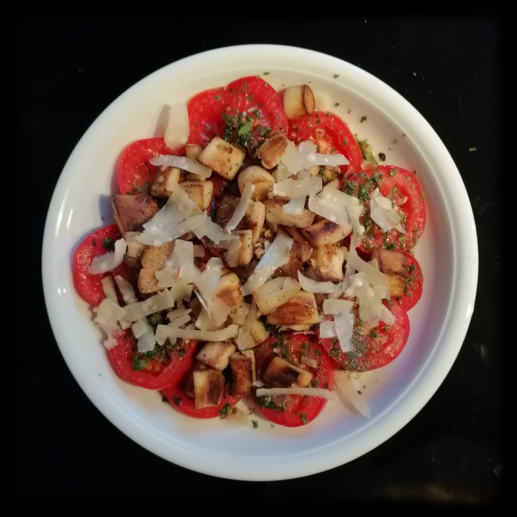 frisch gemahlenem schwarzen Pfeffer würzen und auf den Tomatensalat geben, dann den Parmesan darüberstreuen