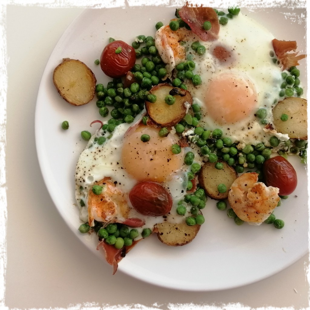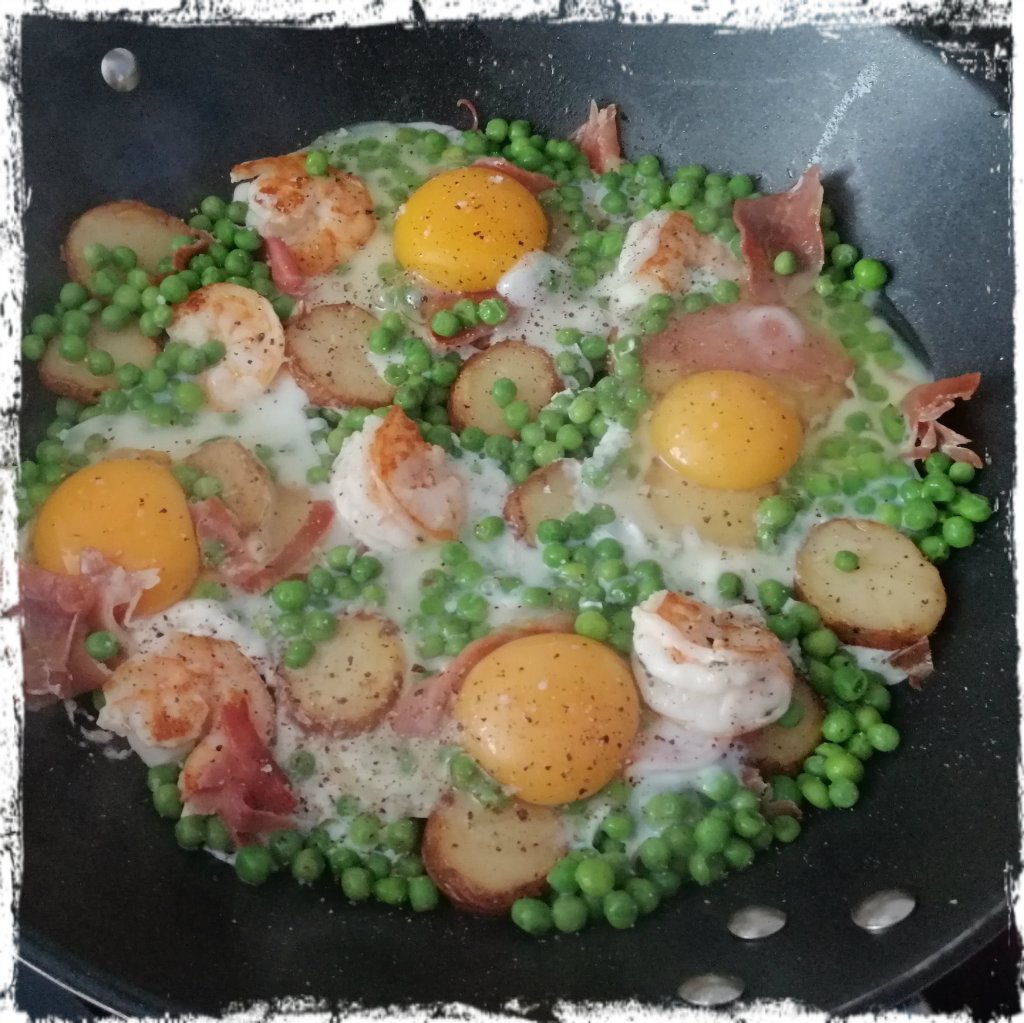 1 EL Bratolivenöl bei mittelstarker Hitze von beiden Seiten goldbraun rösten, dann die Langostinis hinzufügen und von beiden Seiten kurz anbraten, nun den Schinken und die Erbsen hinzufügen und