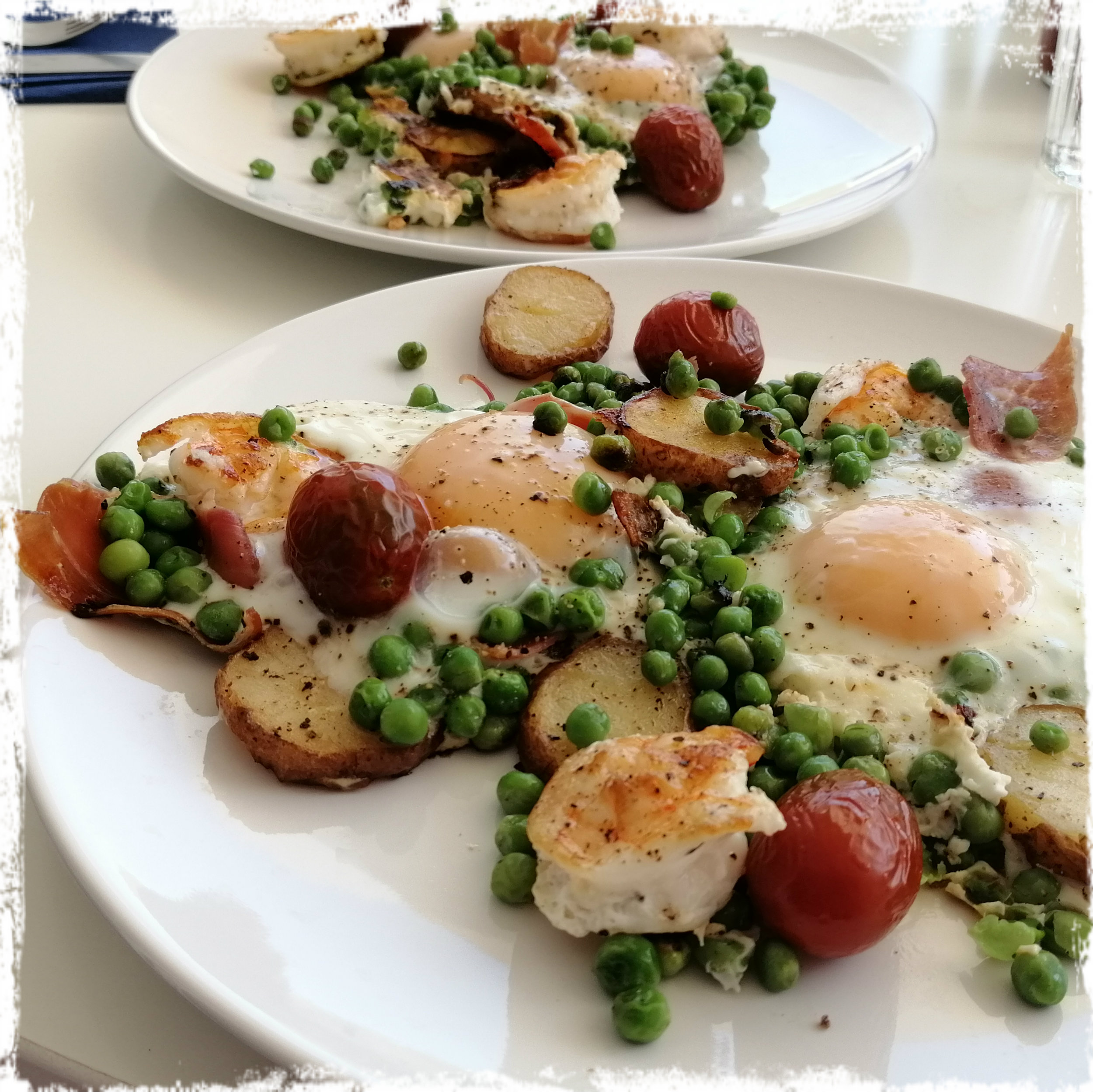 1 EL Bratolivenöl bei mittelstarker Hitze von beiden Seiten goldbraun rösten, dann die Langostinis hinzufügen und von beiden Seiten kurz anbraten, nun den Schinken und die Erbsen hinzufügen und