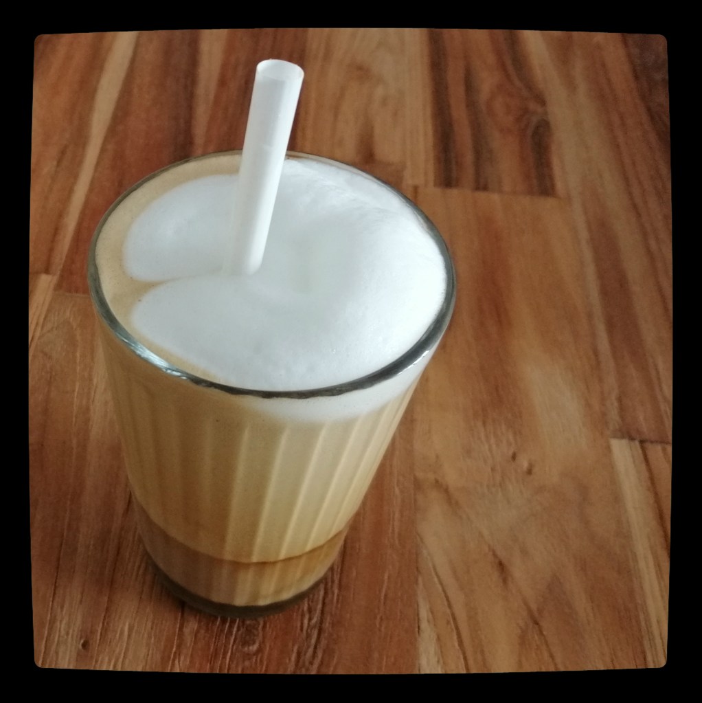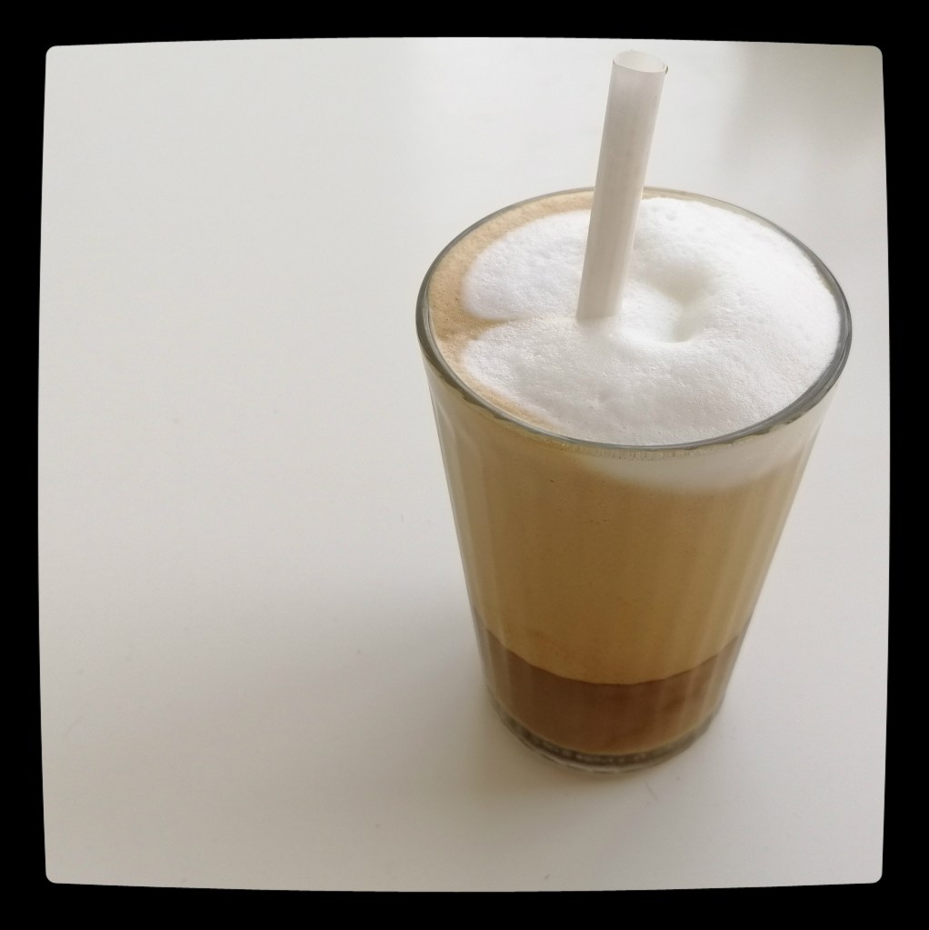 2 TL löslichen Espresso (z. B. von Nescafé) in dem gekühlten Wassers in einem schlanken Glas mit dem Frappeemixer aufschäumen, dann