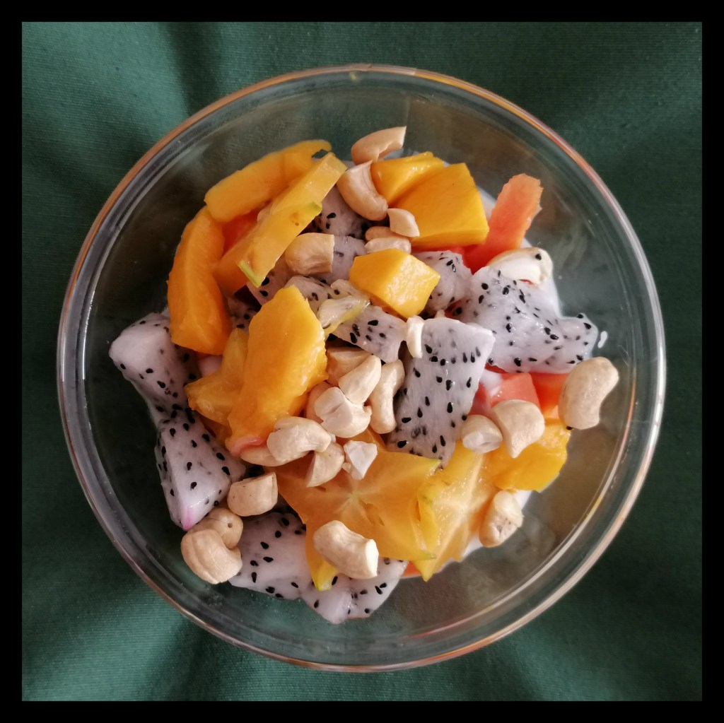 1/2 Karambole in Scheiben schneiden, die Früchte auf den Joghurt geben und mit