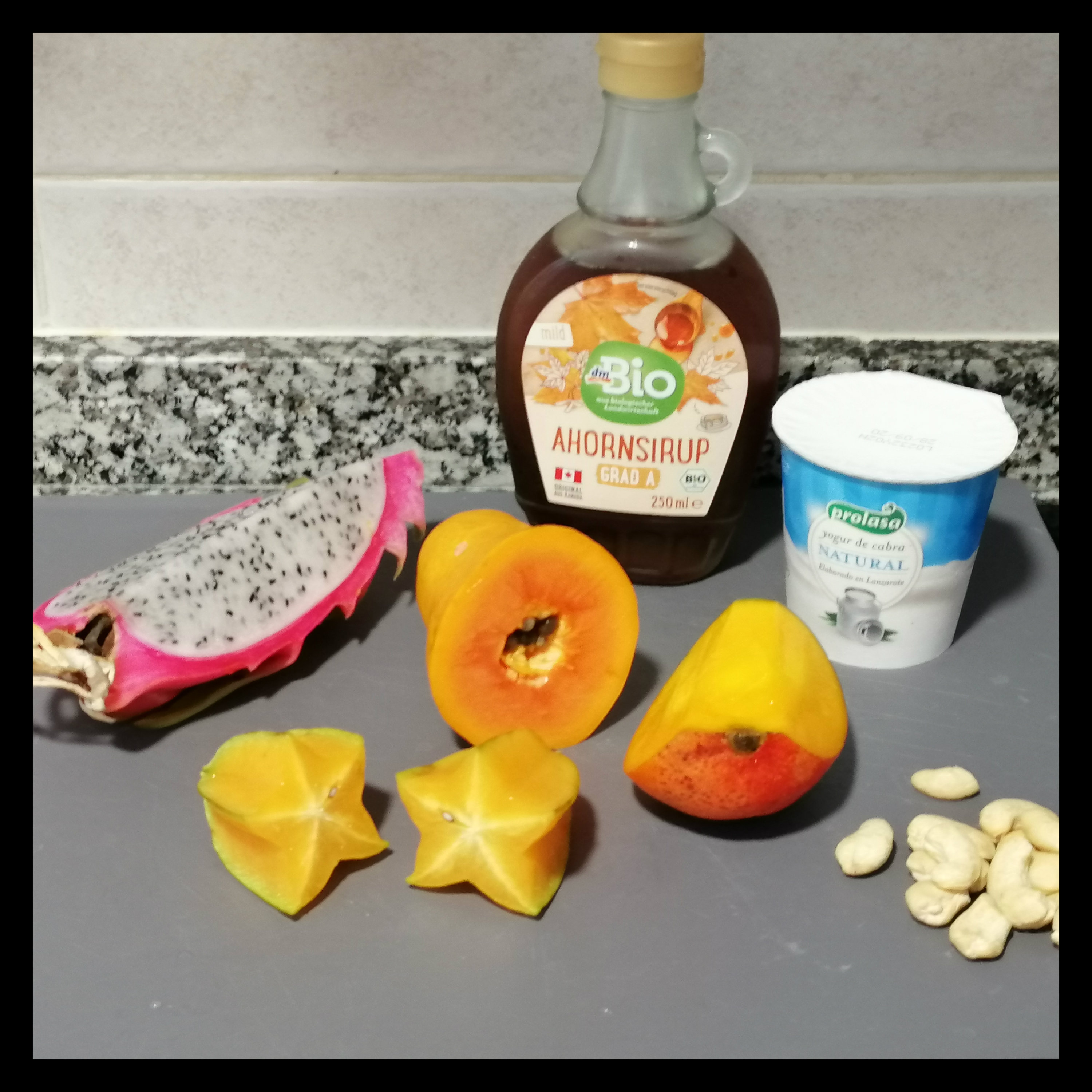 1/2 Karambole in Scheiben schneiden, die Früchte auf den Joghurt geben und mit