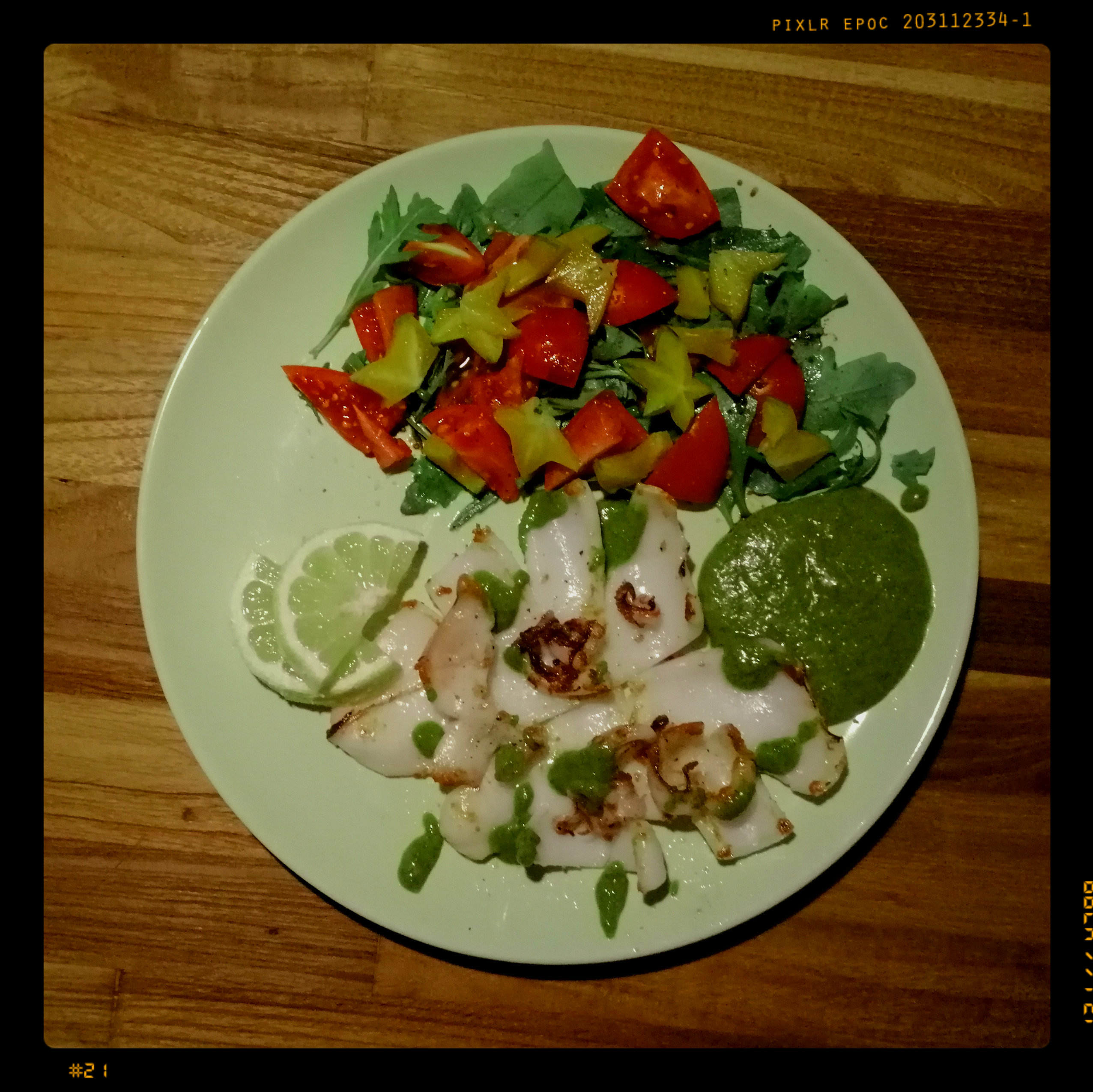 die Calmar-Stücke neben den Salat auf den Teller legen und