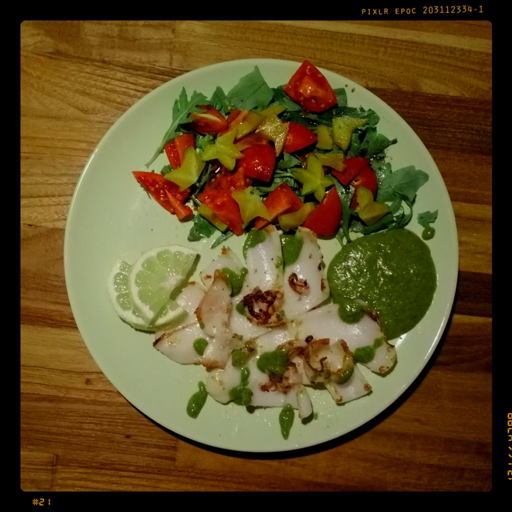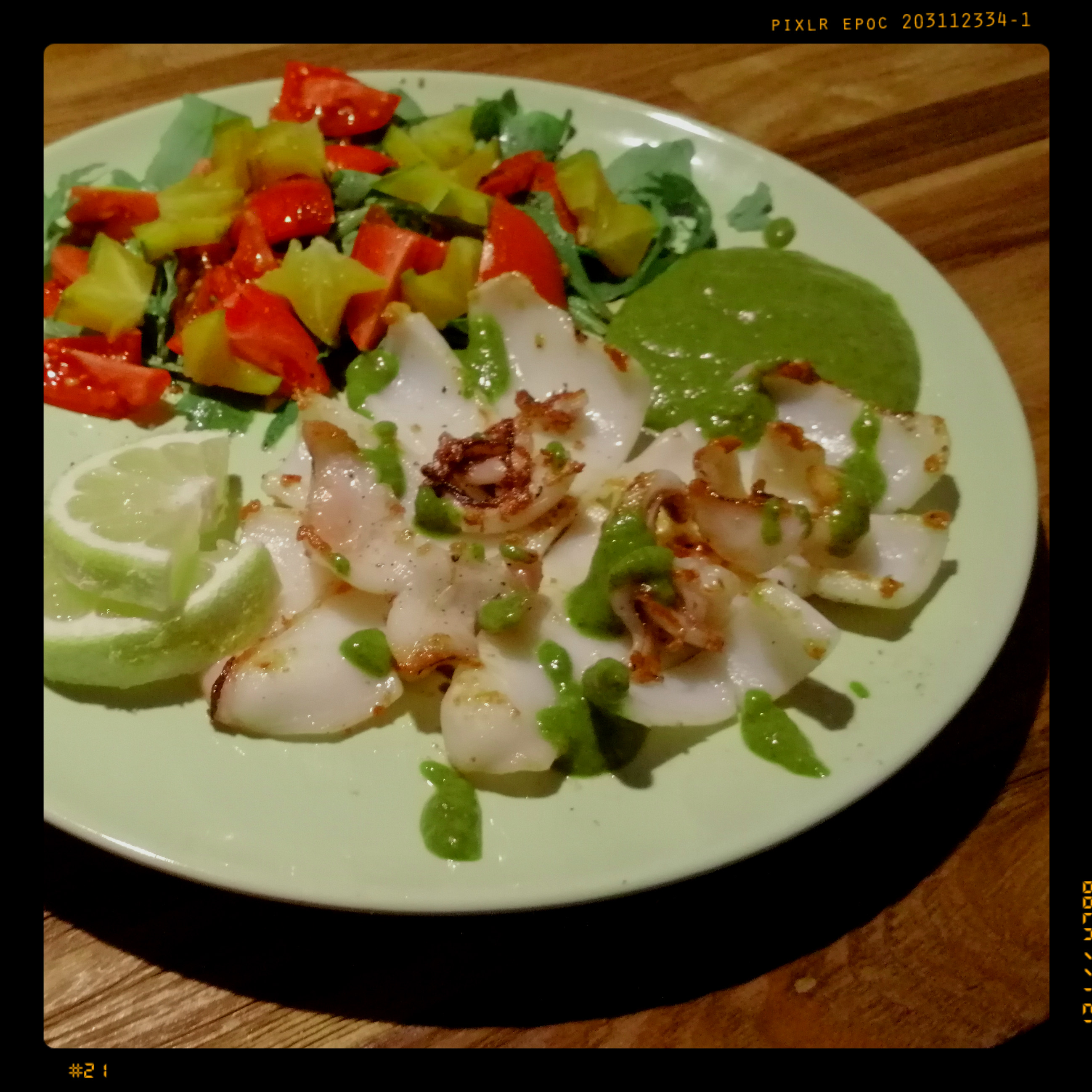 2 – 3 EL Mojo de Cilantro dazu geben, die Zitronenscheibe vor dem Essen über dem Calmar ausdrücken