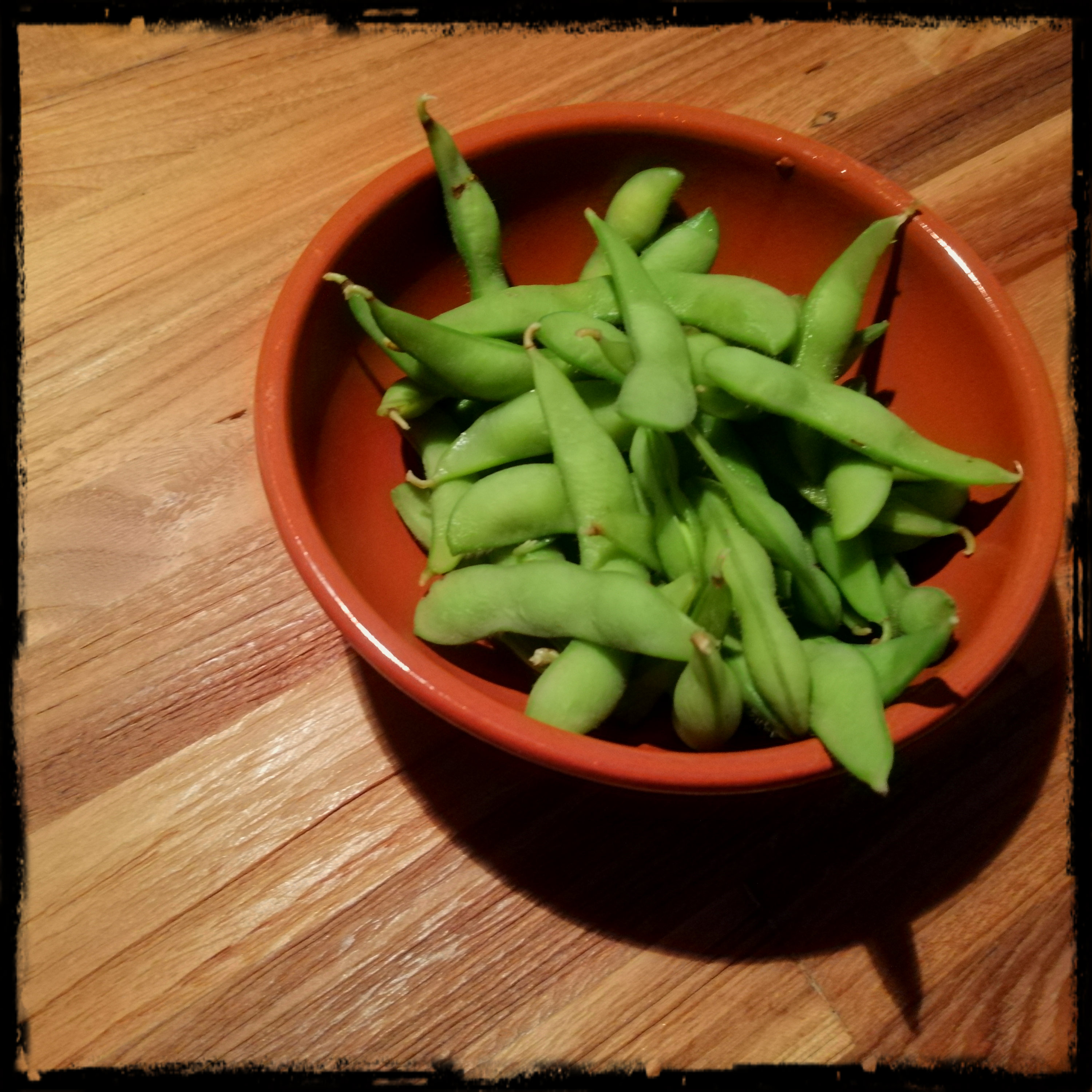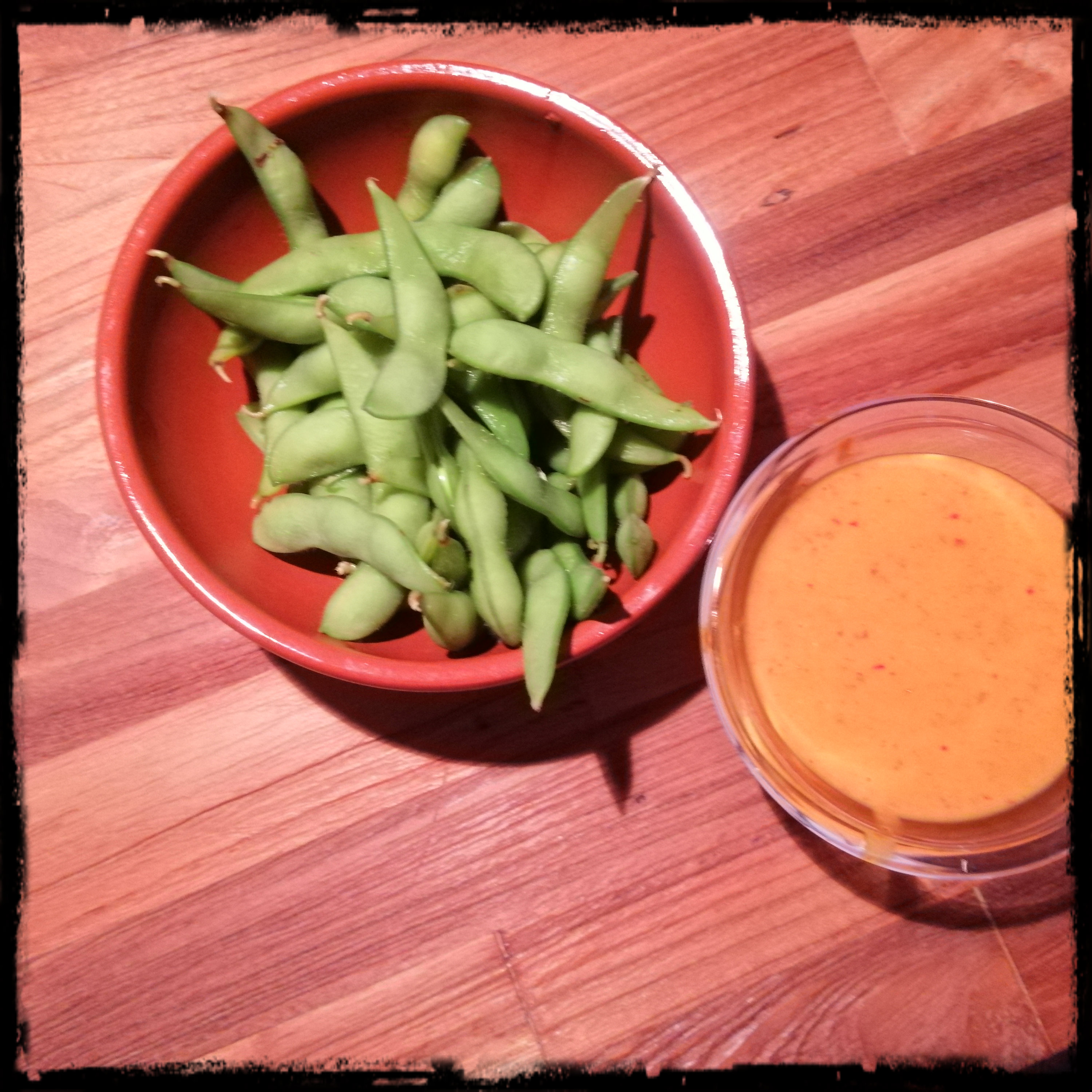 zum Essen die Edamame-Schoten in den Dip tauchen, in den Mund schieben und die Sojabohnen aus der Schote ziehen, dabei die Sauce mit abziehen, die Schote wird nicht gegessen