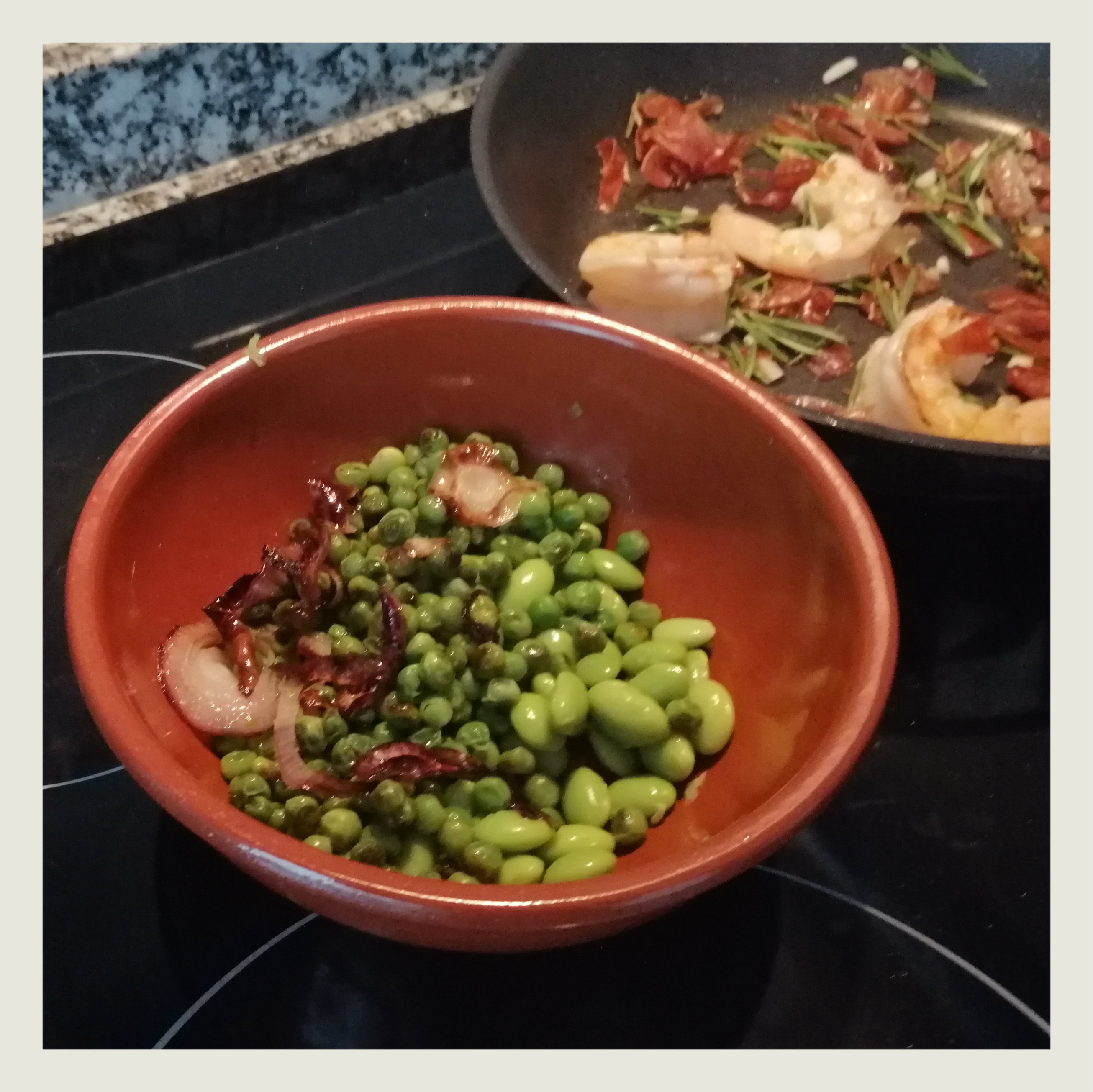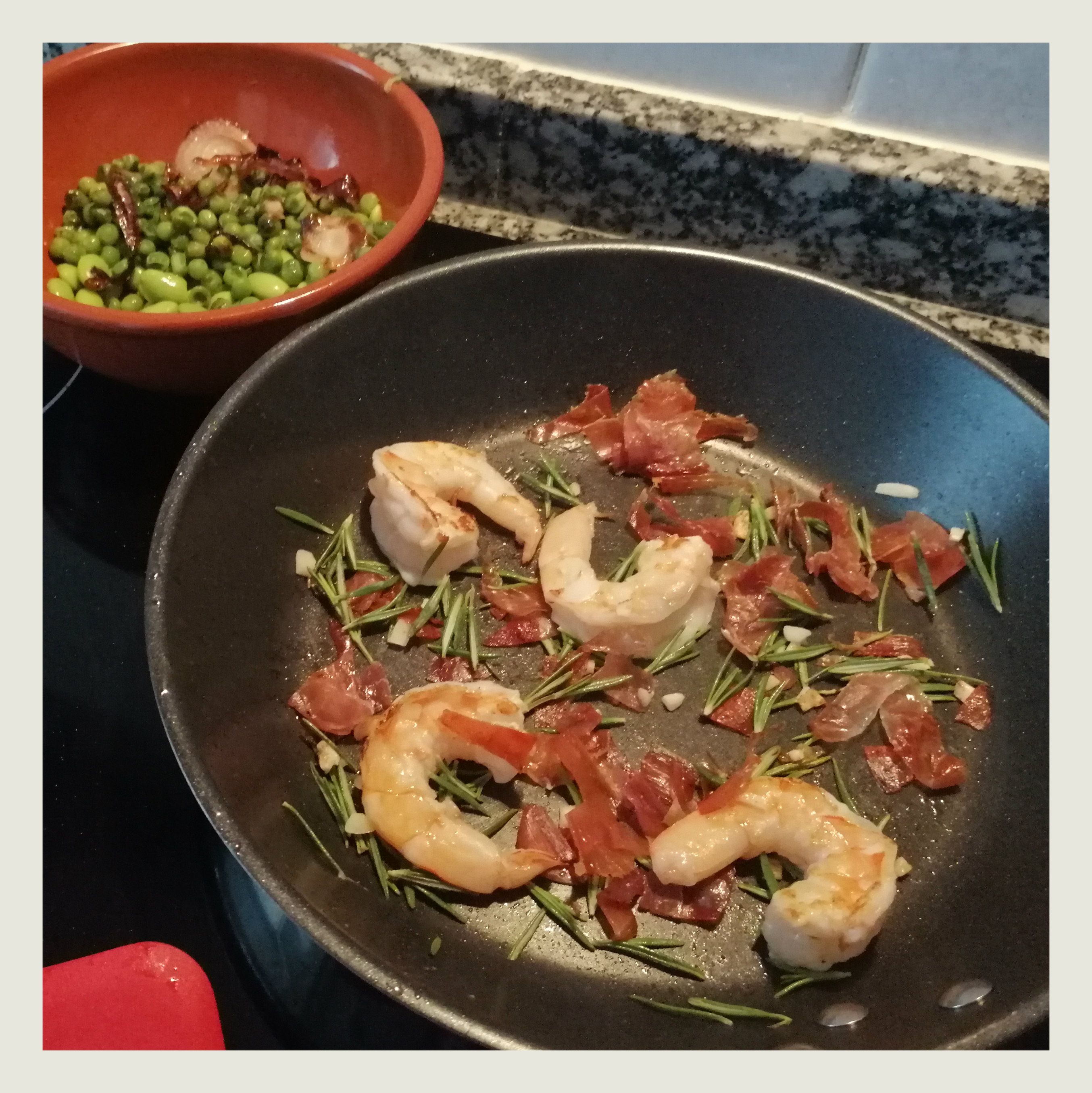 die Erbsenmischung aus der Pfanne nehmen und Langostinis mit Schinken, Knoblauch und Rosmarin von beiden Seiten bei mittlerer Hitze kurz anbraten, währenddessen die Bohnen aus den Edamameschoten lösen und zu der Erbsenmischung geben