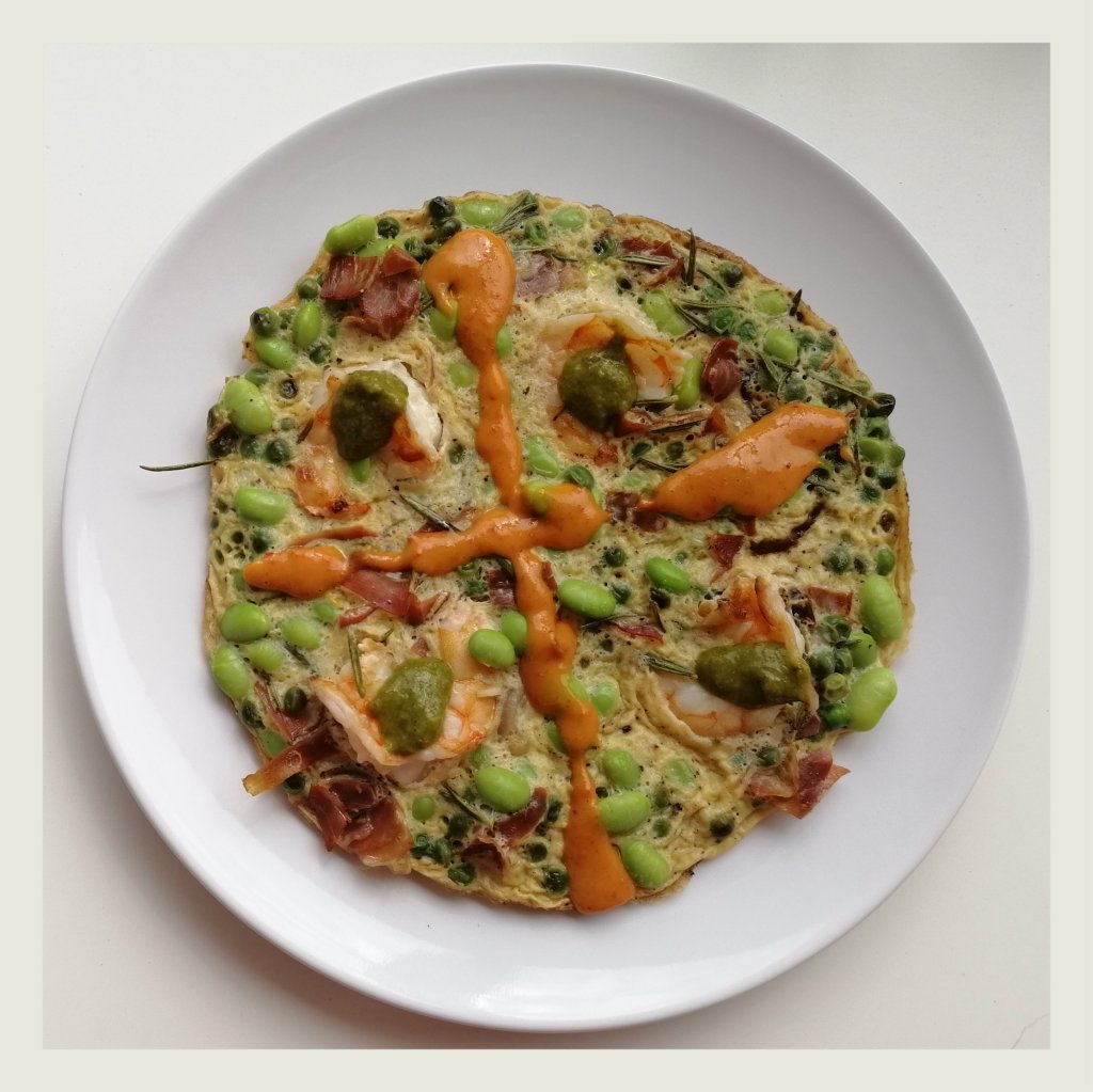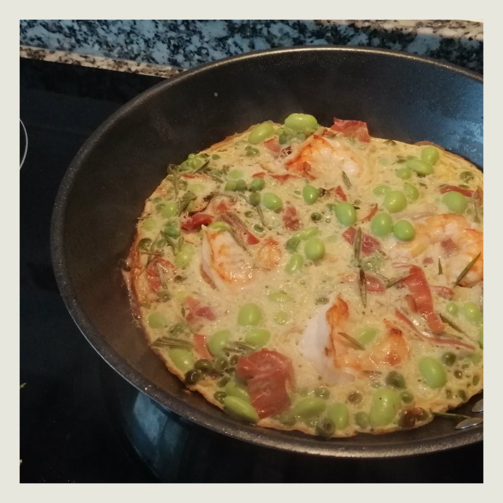 1 EL Brat-Olivenöl einfetten und dann die Ei-Mischung auf dem Boden ausbreiten und die Langostinis auf dem Omelett verteilen, alles unter dem Deckel in ca. 4 Min. stocken lassen