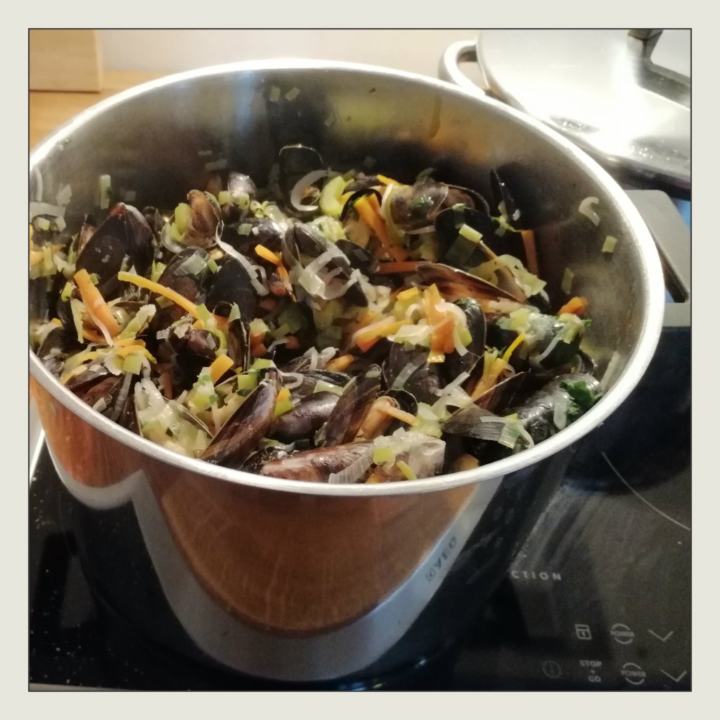 die Brühe wieder zum Kochen bringen, die Miesmuscheln hinzufügen, mit der Brühe vermengen und unter ab und zu Umrühren im geschlossenen Topf ca. 7 Min. bei starker Hitze garen,