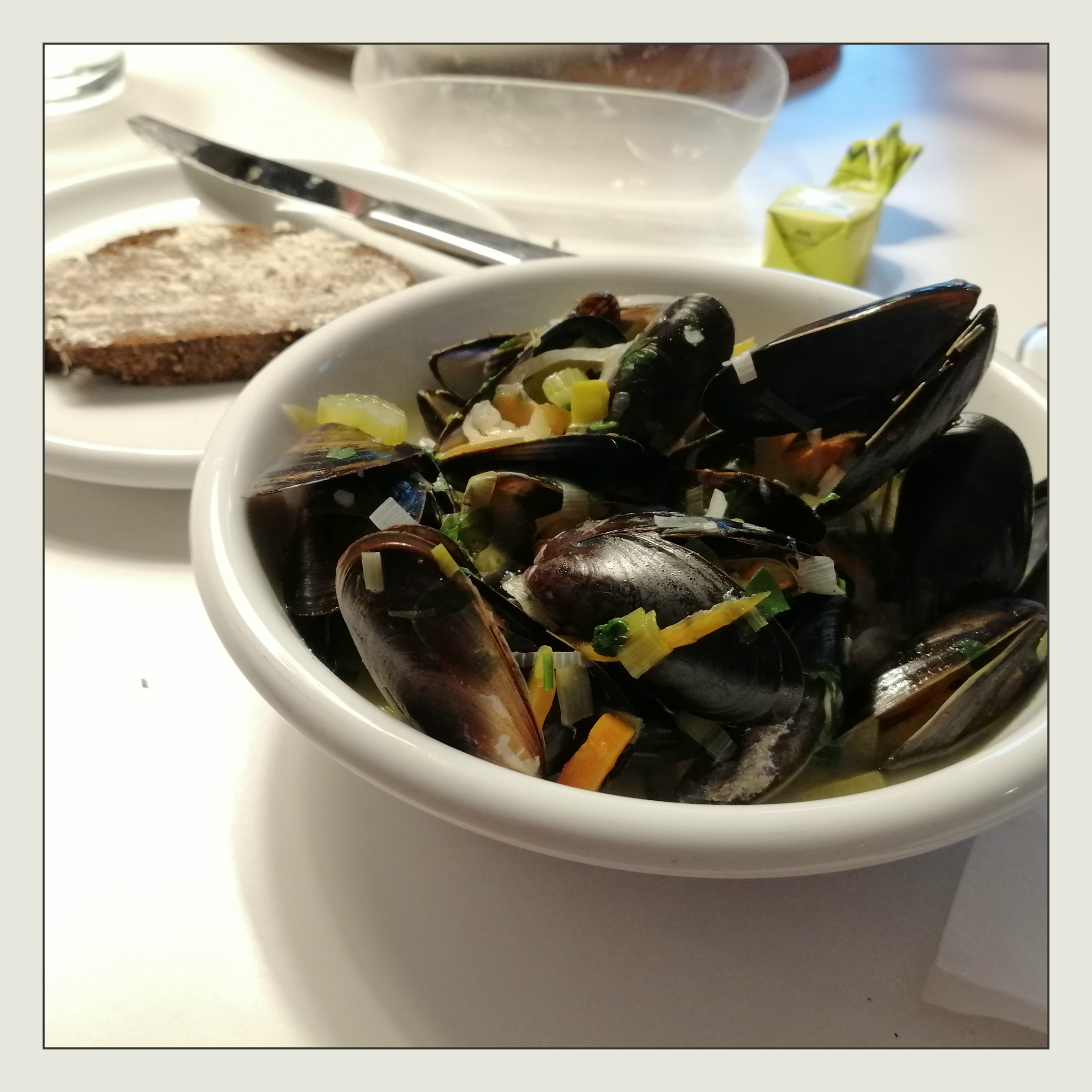 die Muscheln sollten nun geöffnet sein, die Petersilie untermischen und Muscheln mit Gemüse und Brühe auf vier große tiefe Teller verteilen (bei kleineren Tellern eben später nachnehmen), dazu