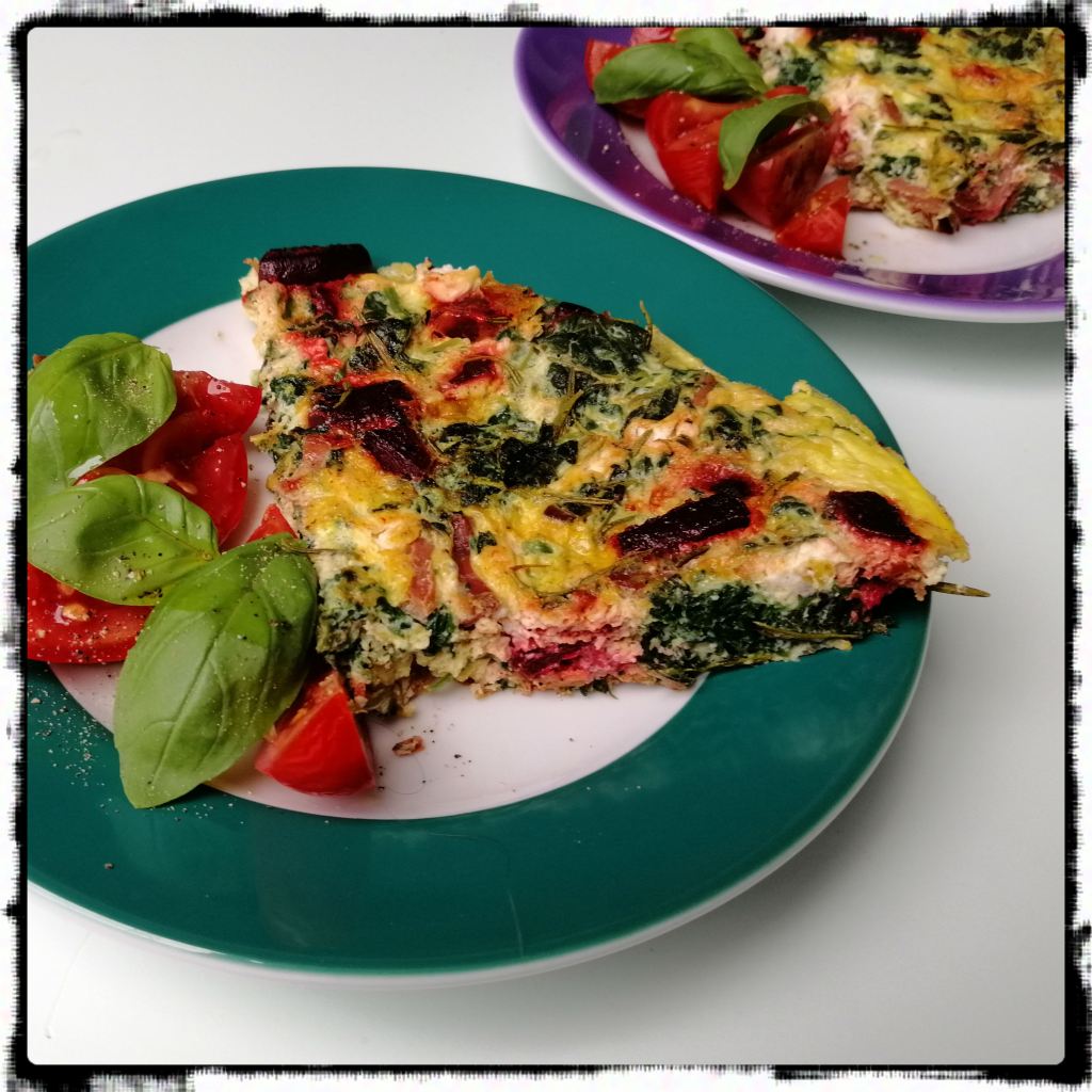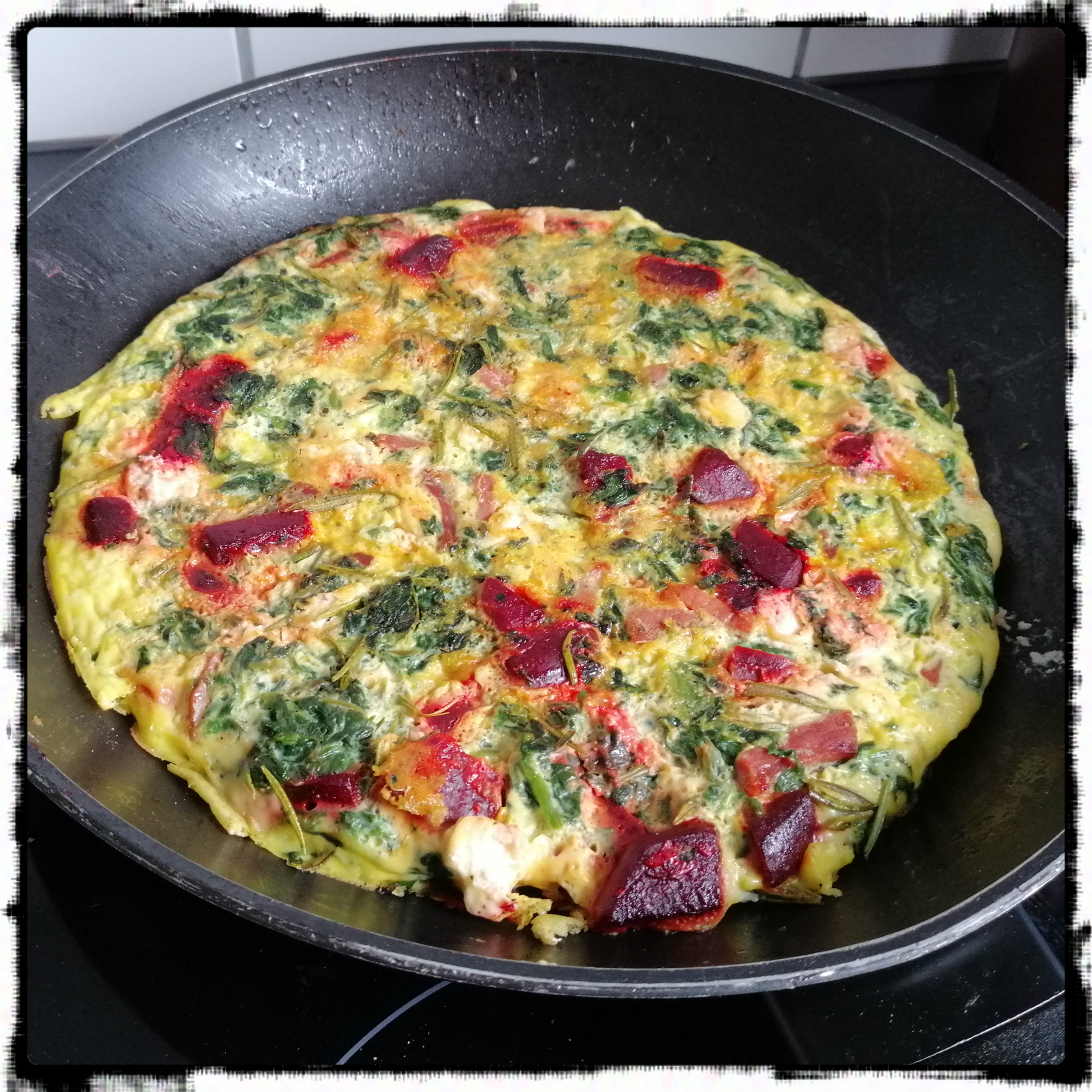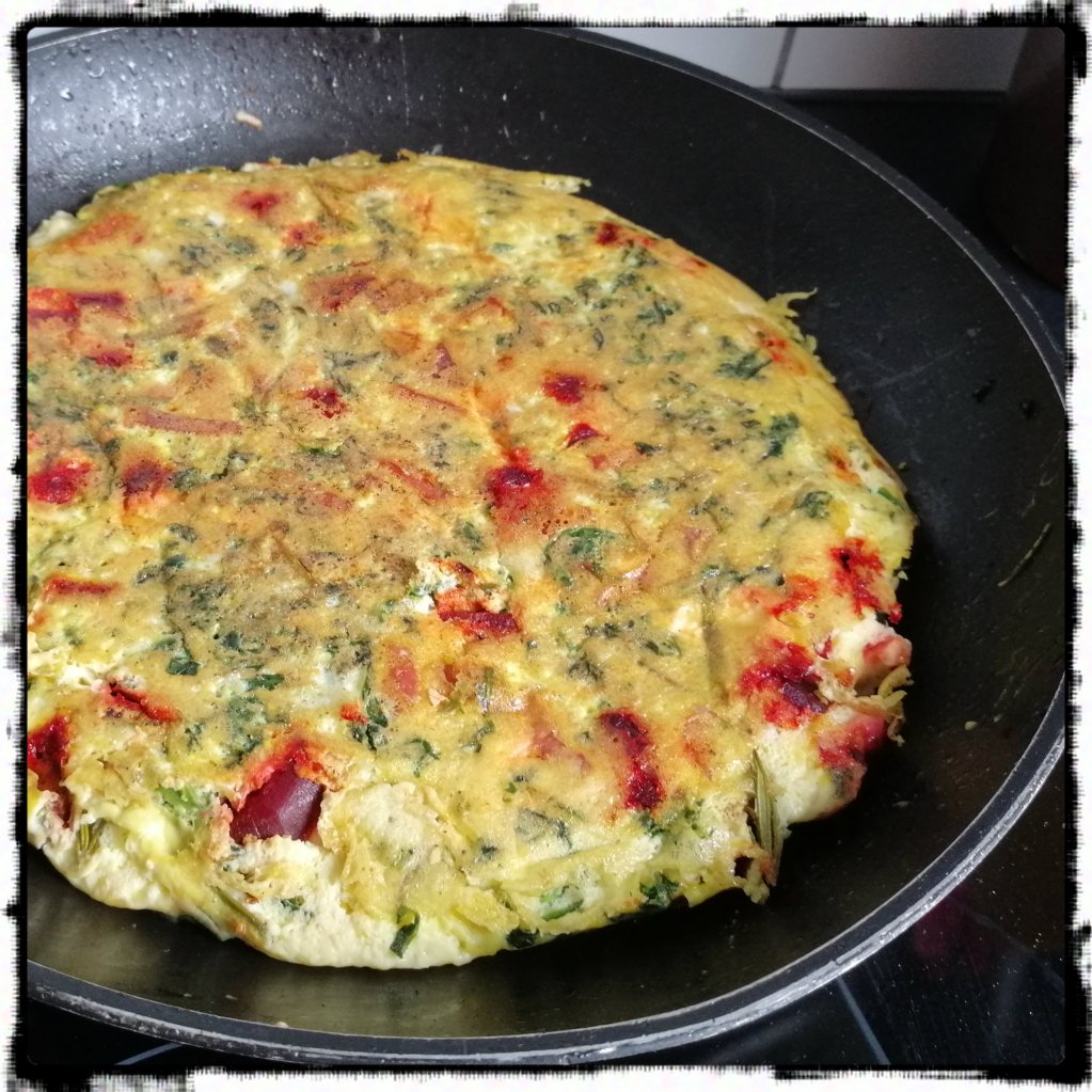 1 EL Brat-Olivenöl in die auf mittlerer Hitze erwärmte Pfanne geben und die verschlagenen Eier hineingießen, die Gemüse-Schinken-Feta-Mischung vorsichtig darauf verteilen, die Pfanne mit dem Deckel schließen und alles ca. 8 Min. garen, bis das Ei gerade so gestockt ist, dann das Omelett über den Deckel wenden und von der anderen Seite noch ca. 3 Min. in der offenen Pfanne braten