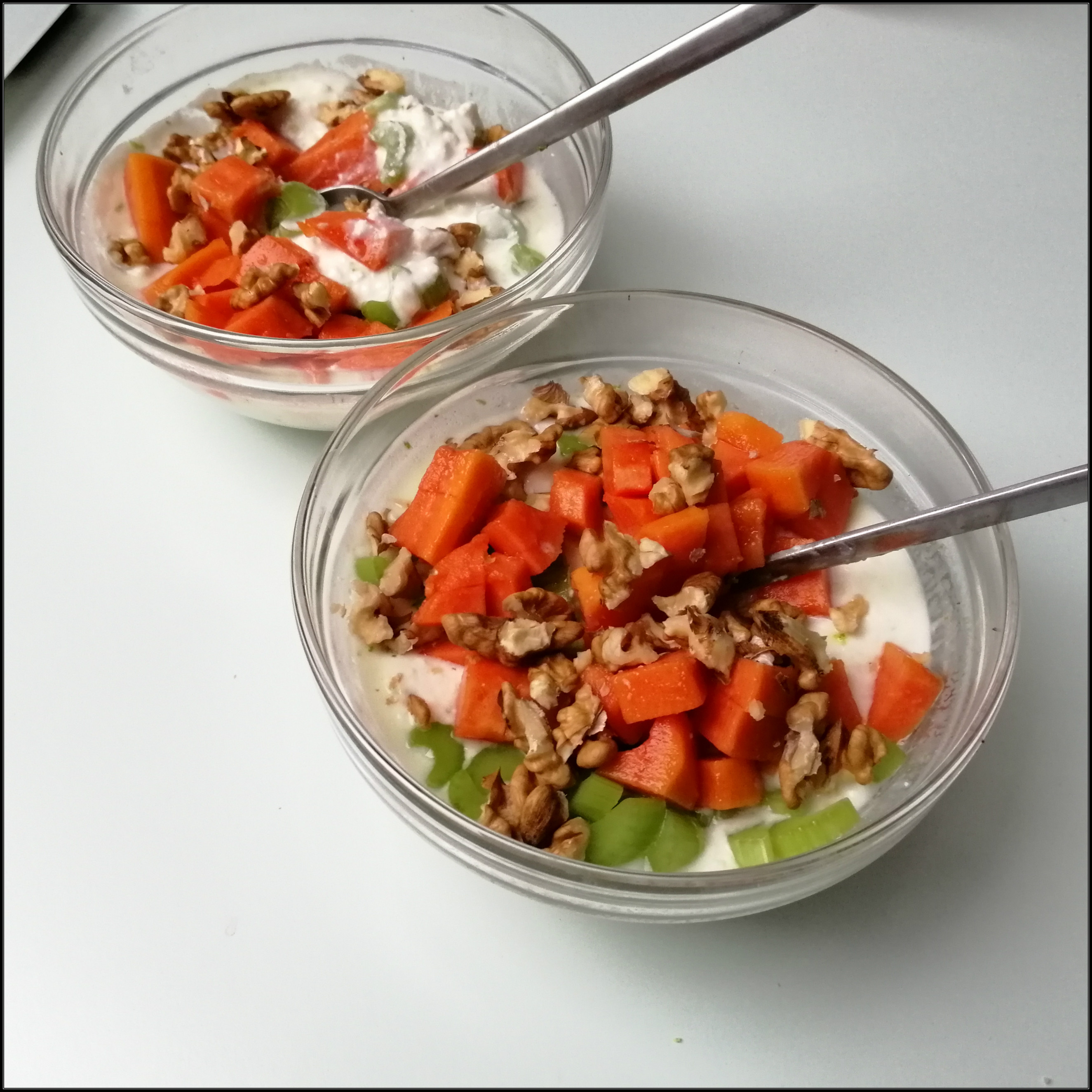 etwa 250 g Papaya (in kleine Stücke geschnitten) darauf verteilen, dann mit
